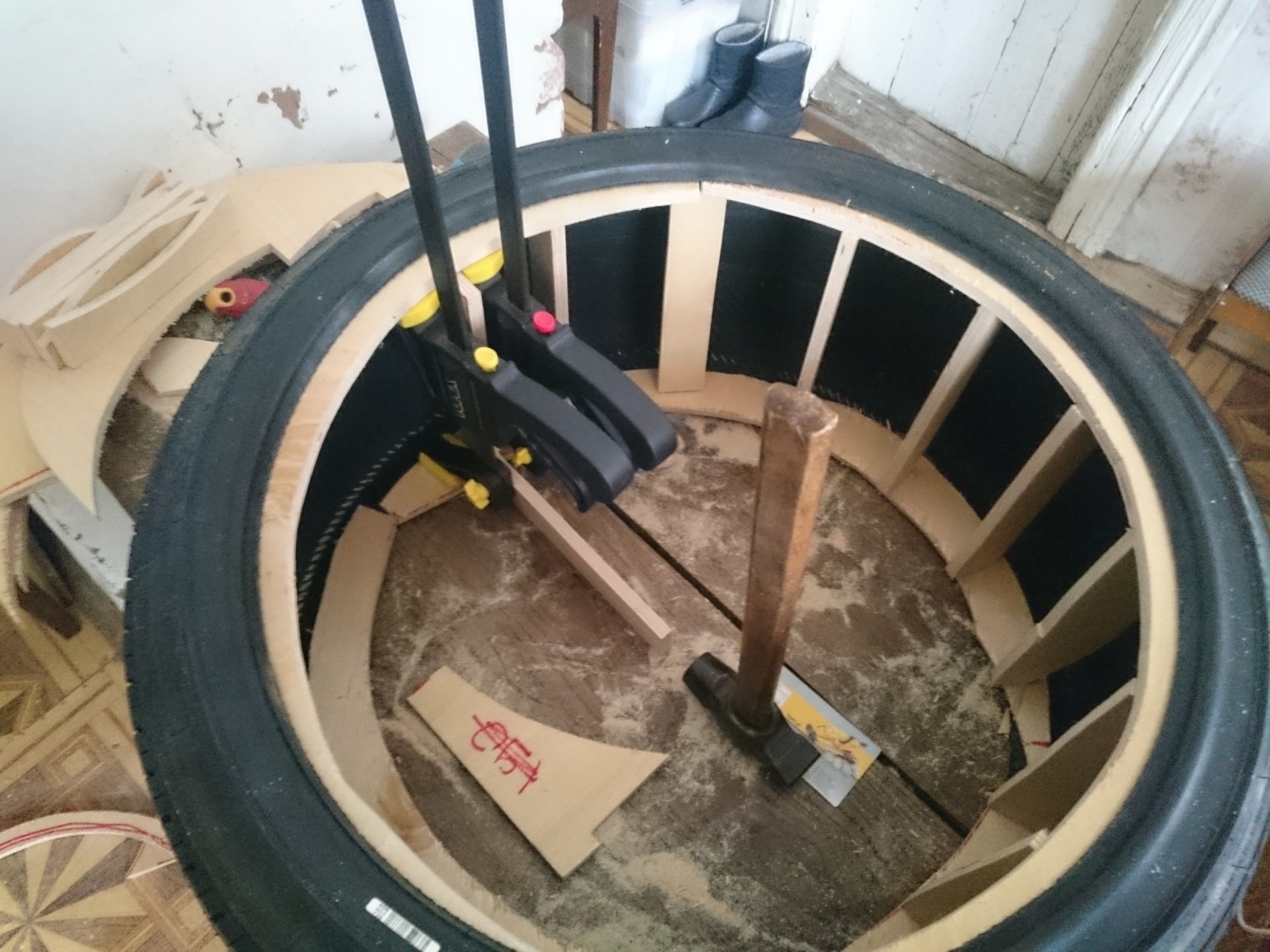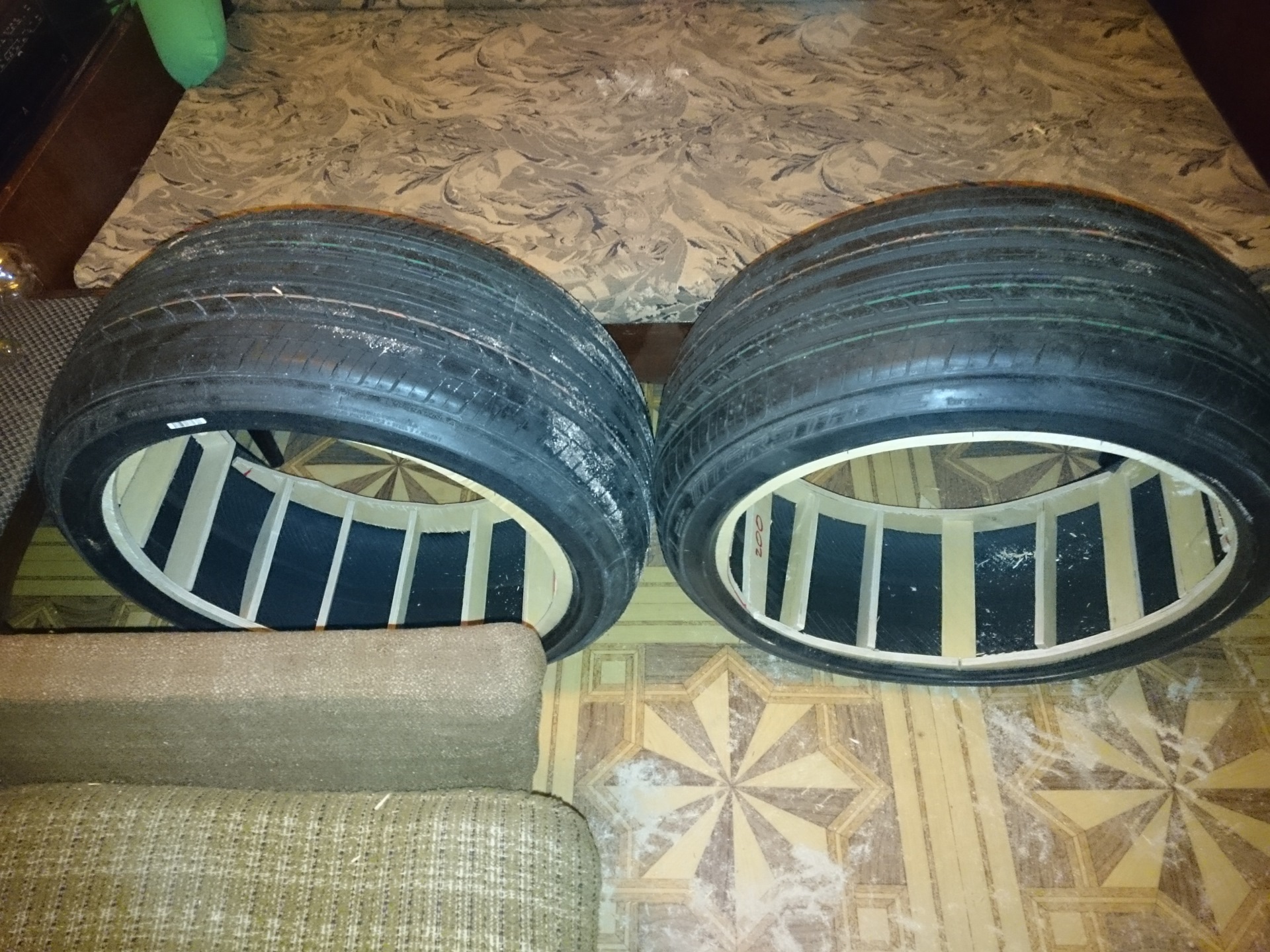 Далее надо готовиться к надеванию этого добра на диски. Почитал умные форумы и понял, что к натягу на 10 дюймов лучше подготовиться заранее, тем более, что боковина у этого интерстейта ого-го. Замерил посадочную ширину (на всякий случай:)) и, о чудо, ровно 10 дюймов = 254 мм! Ну ладно, заготовил серпов фанерных, чтобы распорками не повредить резину, сами распорки, и начал растягивать. Ну ппц удовольствие, скажу я вам. Второй день руки болят:) Пришлось пойти пару струбцин купить, распорками фиксировать было трудно и неудобно. Струбцинами, правда, тоже трудно, но немного более удобно. Потратив несколько часов с перекурами, просмотрами сериалов и укладыванием сына спать, разделал первый баллон. Выглядит, кстати, недурно. А там и второй подоспел.