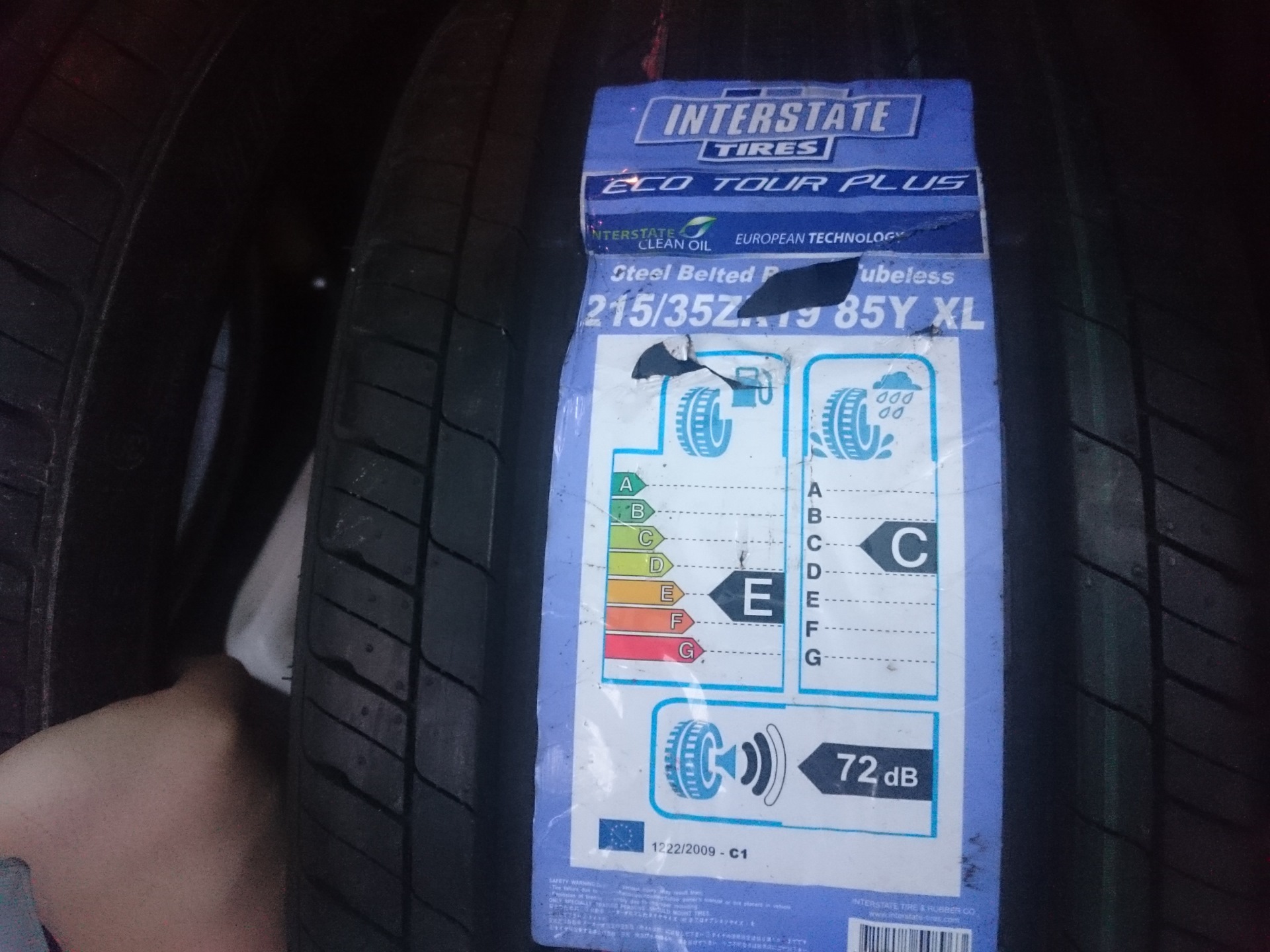 Третий пункт у нас про резину. Думал, думал, читал, читал, почти решился на ханкук S1, но подумав про суммарную цену за 6 колёс и непонятный пока для меня режим "изолента чо", решил, что попробовать можно и чего попроще сначала. Наткнулся по очень хорошей цене на неизвестную доселе [мне — прим. авт.] резину interstate. Голландия (на сайте так написано:) Кетай, ессно, но по отзывам очень положительно + рисунок обещает быть не шумным и он симметричный (inside=outside), что даёт возможность перевернуть колесо по мере развального износа и продлить его жизнь. Размер был выбран щадящий 215/35/19. Модель Eco tour plus. Цена 25 тыщ за 6 новых колёс — неплохо, я считаю.