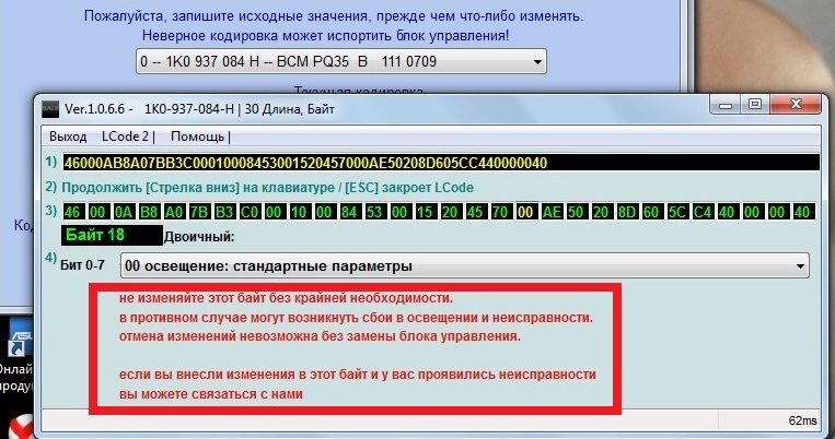 Я после установки нового образца BCM взамен старого, перебирал 18 байт, перепробовал раз 80. Подобрал для своей машины подходящую параметрию. Блок 5К0937086М не убил. Так еж пробовал на 1K0…087D и 5K0…087R всё работало штатно. В процесе перебора была такая "ЁЛКА" что думал что хана, но нет одна из параметрии подошла как родная. Допускаю что блок можно убить. Ребята кто не имеет кучу блоков для экспериментов как я и не хочет рисковать, доверяйте это дело профессионалам, сэкономите кучу нервов и денег.