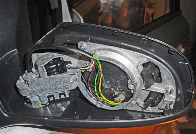 21 (7,5 А) — обогрев боковых зеракал. Включается обычно при нажатии на кнопку обогрева заднего стекла. Если перестал работать обогрев бокового зеркала, проверьте проводку между кузовом и дверью, а также в самом зеркале. Для этого снимите накладку или всё зеркало и проверьте контакты в разъёме внутри него. Часто нижние контакты обгорают или окисляются. Если обогрев зеркал не работает совместно с обогревом заднего стекла, проверьте также предохранитель 11. Фотография проводки и механизма внутри зеркала при снятой накладке: