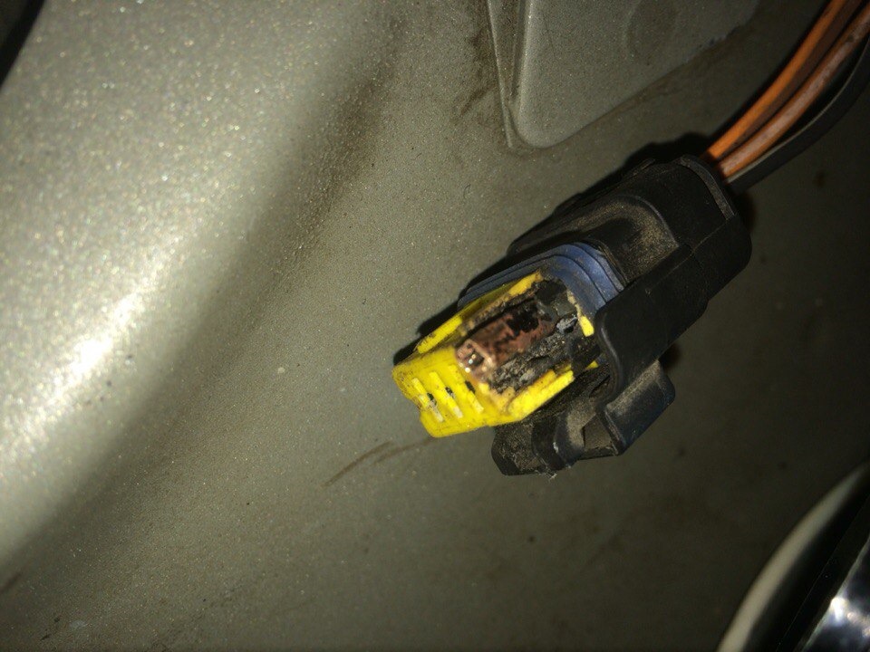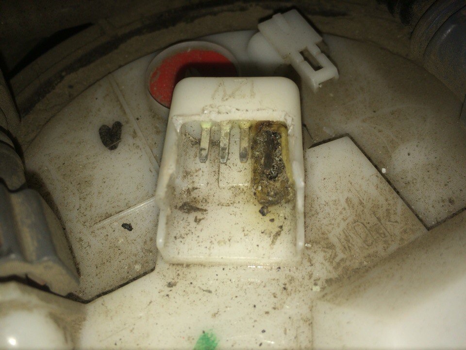 Позвонил Антону TacH21213, обрисовал ситуацию, вместе решили что кроме бензонасоса ничего быть не может. На всякий случай попросил его приехать подстраховать и помочь с авто. Пока он ехал я добрался до фишки (не так просто было это сделать с детским креслом, как оказалось) о ох.л от возникшей картины! Фишка со стороны массы сгорела в труху, контакт на разъеме ушел вниз от температуры и почернел настолько, что ножом я так и не смог его отцарапать нормально.