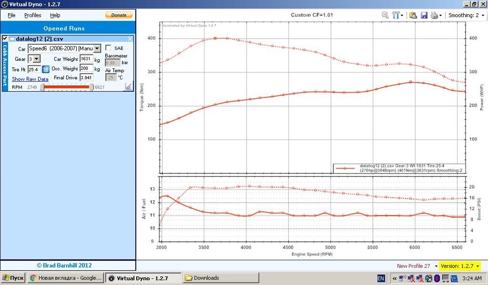 2. Горб мощности на 5948 оборотах — так это ж не реальная мощность, все кто строят графики в ВД знают, что такие скачки надо игнорировать, это скорей всего кривизна дороги, где машина явно ускорилась. И если пренебречь этим горбом, и провести усредненную линию, то получим визуально очень похожий график на тот, что сделан предыдущим настройщиком, НО будем иметь всего порядка 250 л.с, когда раньше было 263 л.с. c-a.d-cd.net/955b646s-960.jpg