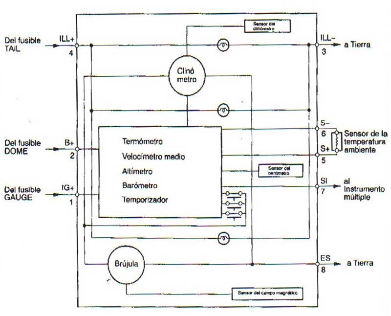 Нашел схему (правда на испанском), подключил, проверил — работает. Попросил приятеля, который занимается стеклопластиком подогнать кренометр под элементовскую панель и покрасить. Получилось не плохо) Теперь есть компас, альтиметр, кренометр, спидометр и температура воздуха. Пришлось повозится с поиском сигнала спидометра, он нужен кренометру для работы компаса.