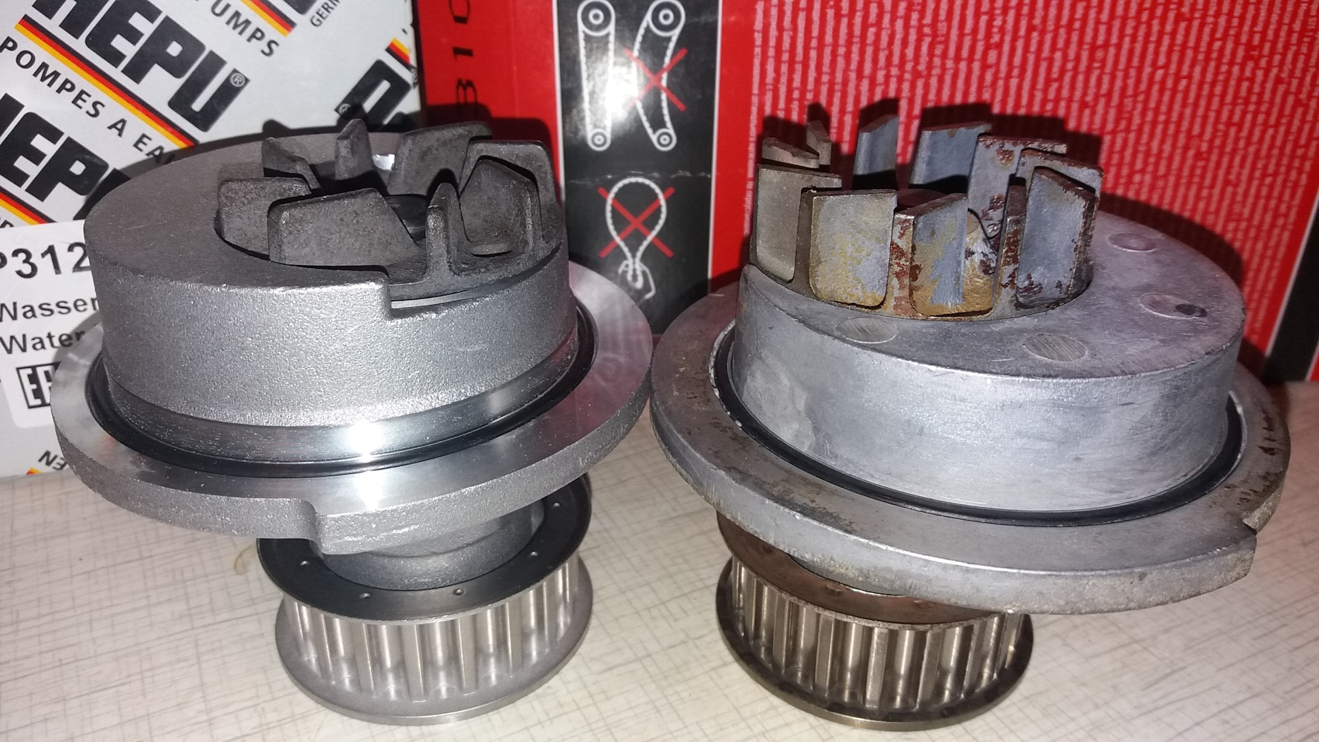 Здравствуйте! Сегодня забрал на Авео помпу Hepu P312 (GM 96352648). Обошлась в 1400 рублей.Крыльчатка чугун-магнитится, но какая то она маленькая, высота 11 мм и 8 лопастей. На старой Фаговской их 11 и высота18 мм. Подскажите, может сдать ее нафиг? Сомневаюсь в ее производительности.