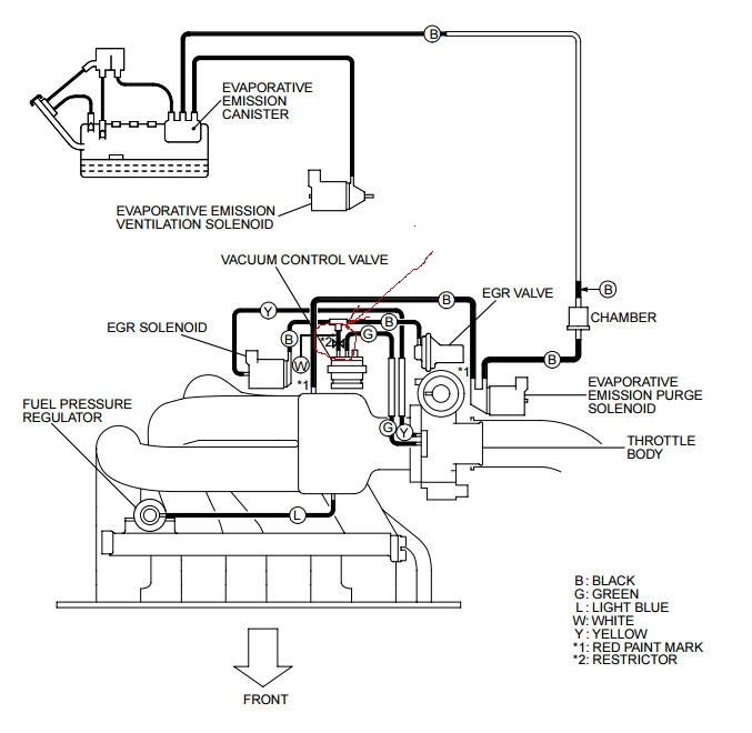 Далее снял все остальные трубочки системы ЕГР и также промыл очистителем карбюратора вместе с другими клапаночками и грязи вытекло не мало. затем продул все сжатым воздухом и собрал на место. ВНИМАНИЕ при промывке продувке одной из трубочек находится ограничитель потока (маленькая втулочка с отверстием с маленькую иголку НЕ ВЫДУЙТЕ И НЕ ПОТЕРЯЙТЕ ЕЁ)по схеме она обведена красным кругом.
