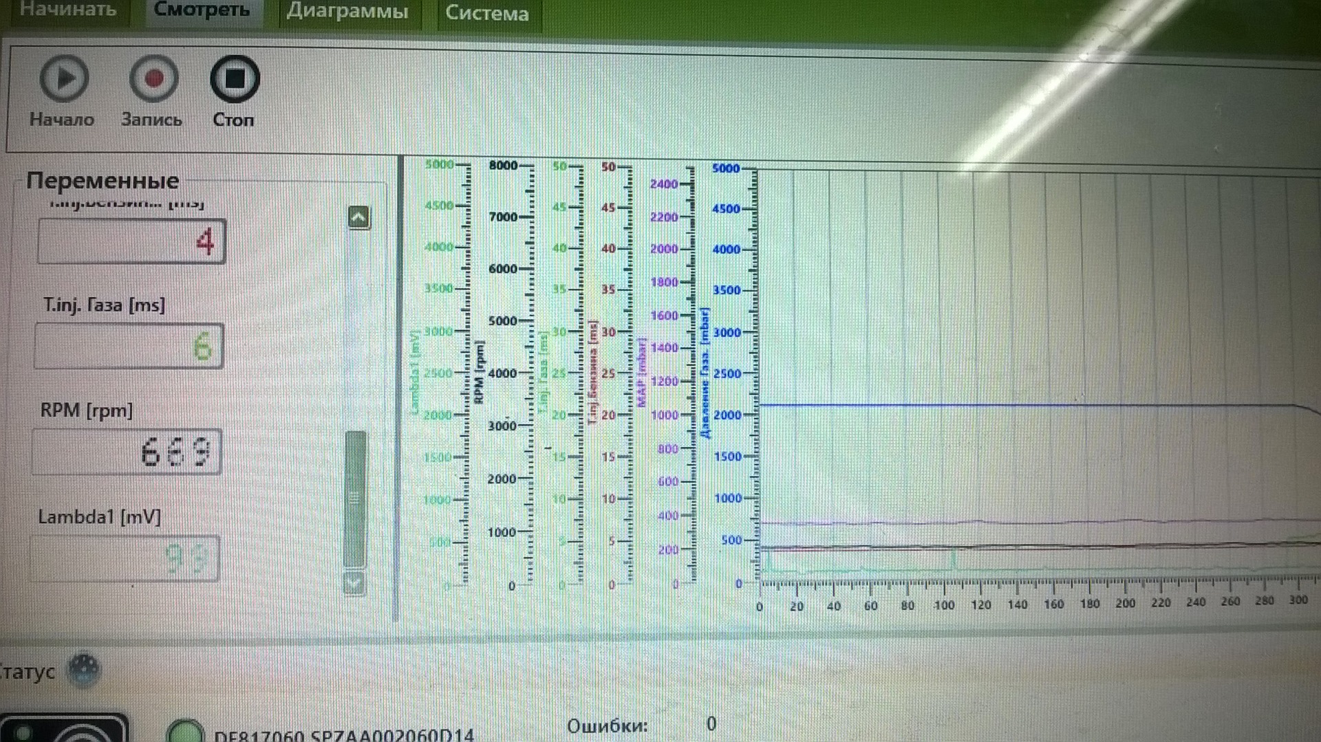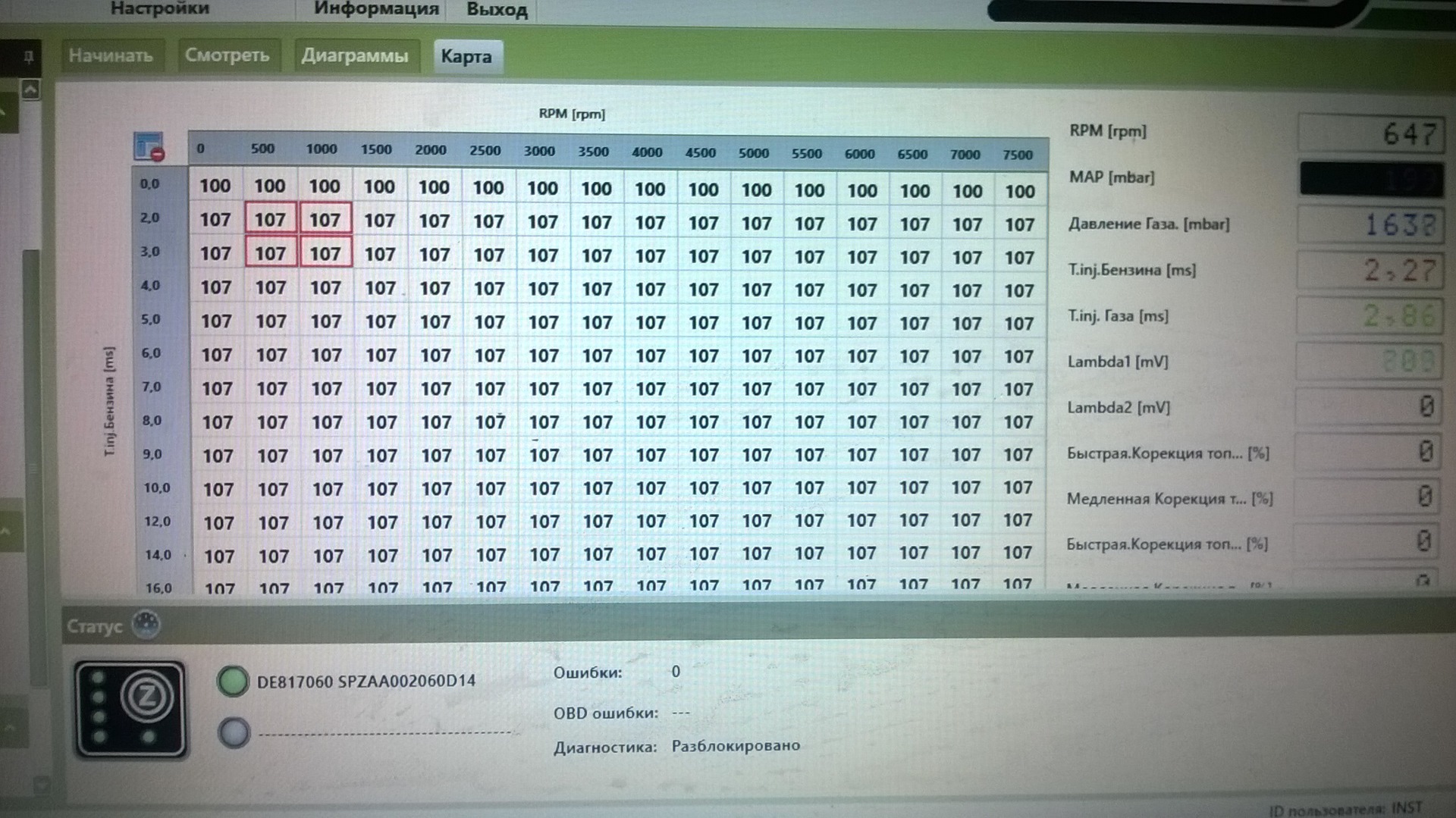 Подключился к газовому ЭБУ и начал смотреть время впрыска БФ и показания ДК.