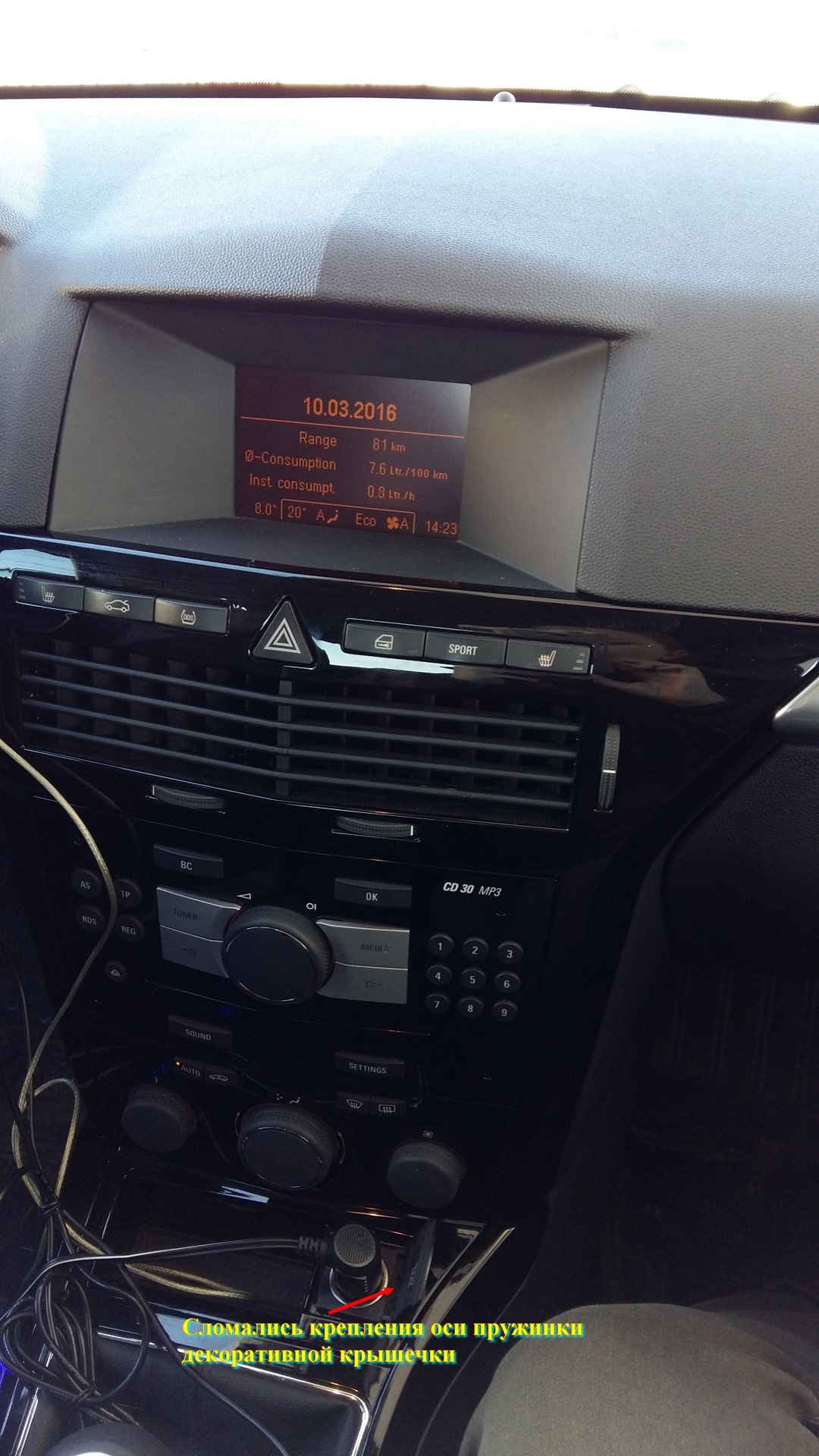 Ну и проблема, отломалось крепление оси пружинки защитной крышки розетки 12V. Придется думать о ремонте