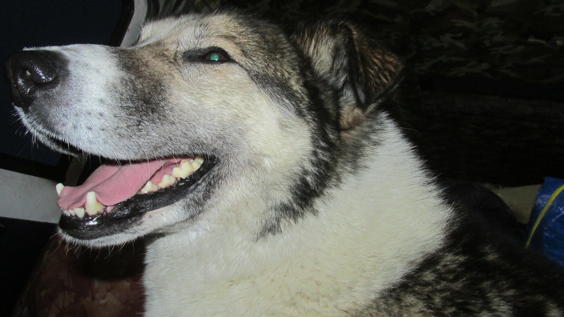 старенький песик, клыки стерты.молодец песик .