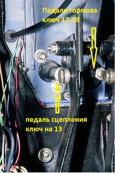 Далее педаль сцепления, на штоке цилиндра есть контргайка на 13 расслабив ее появляется возможность, вращая шток поднимать или опускать педаль.