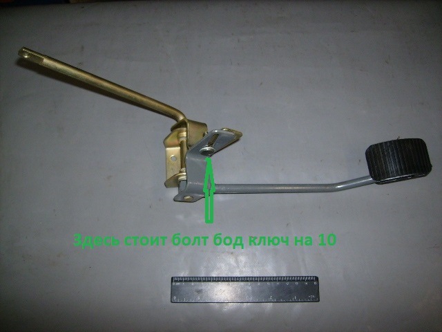 Начнем с педали газа, у Волги она состоит из двух частей соединенных болтиком как показано на фото. При ослаблении оного появляется возможность перемешая его регулировать две части относительно друг друга.