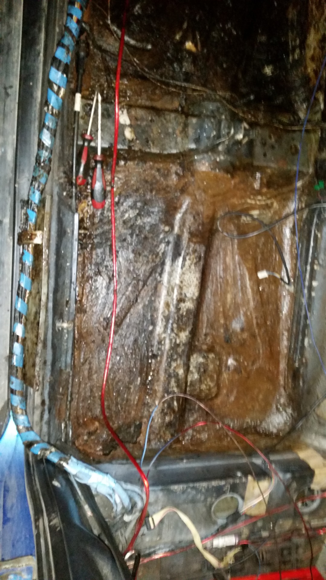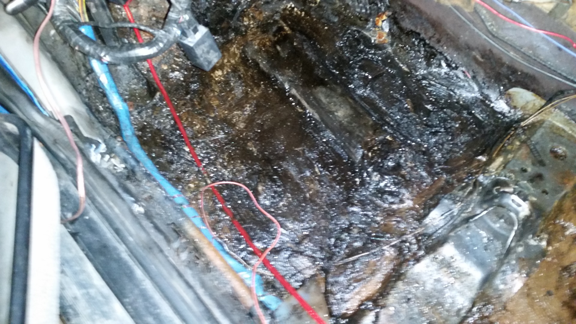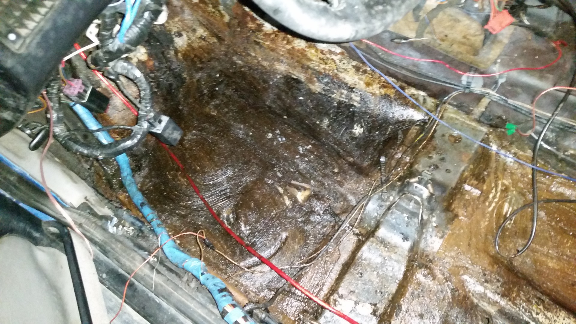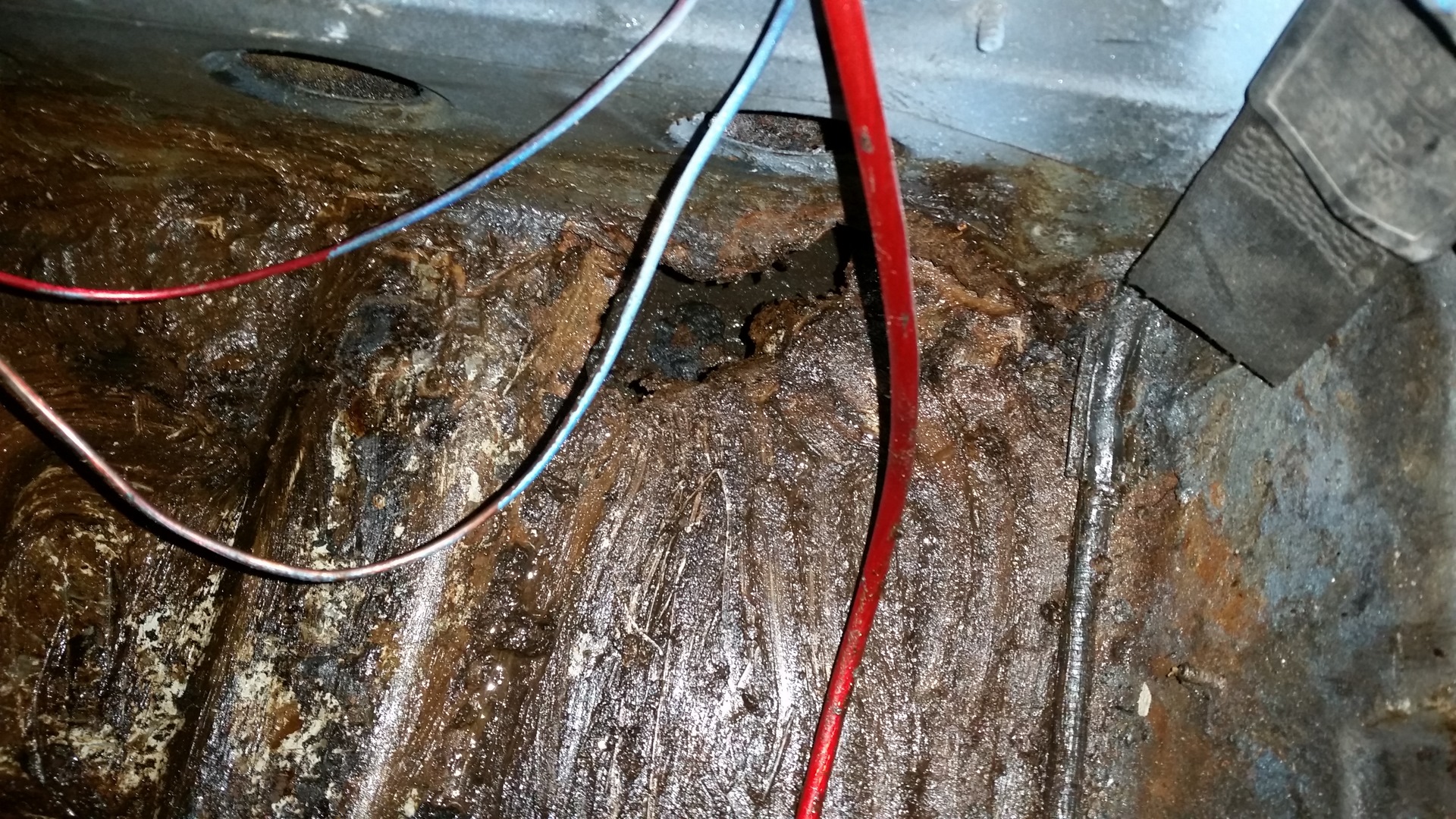 Хрень эта вязкая, у задних сидений золотистого цвета, в передней части черная, как будто родная виброизоляция растворилась… от воды ведь не могла? Счистил большую часть этой гадости и обноружил дырку((( в наружнем углу у заднего сидения, такая же дырка справа, но там родная вибра на месте и почти целая. Короче вопрос номер 2: чем это намазано?