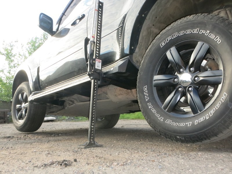 Теперь, не только можно таскать себя за волосы, установленным ранее тоже у Самоваров, лебедем, но и поднимать себя не только под рычаги, что в грязи абсолютно невозможно, но и за бока хай-джеком (специальные места для клюва предусмотрены). Ширина порогов оберегает борт от возможных повреждений реечником при подъеме. Одну фотку чужую прицепил с реечником (надеюсь, не убъет автор). У меня пока нету такого.