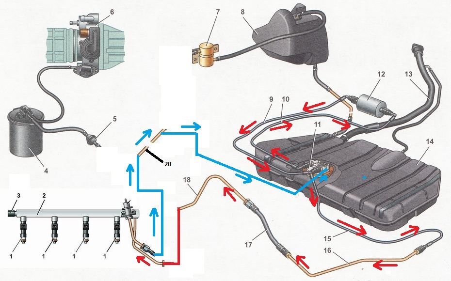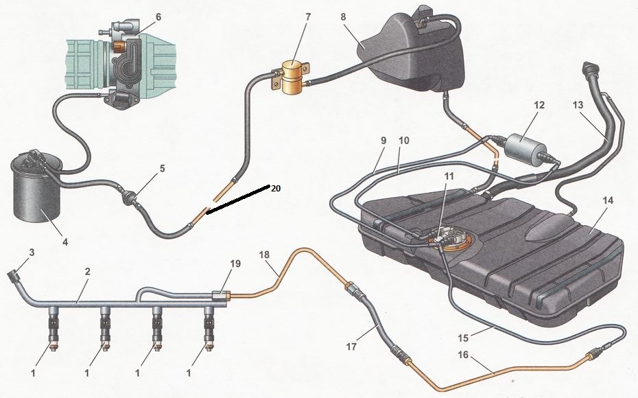 5.Металлическая трубка 20 идет от подкапотного пространства до отстойника адсорбера 8. В районе моторного отсека перерезаем трубку и прикрепляем шланг 21101-1104218 на хомуты, с другой стороны прикрепляем к обратке рампы старого образца.