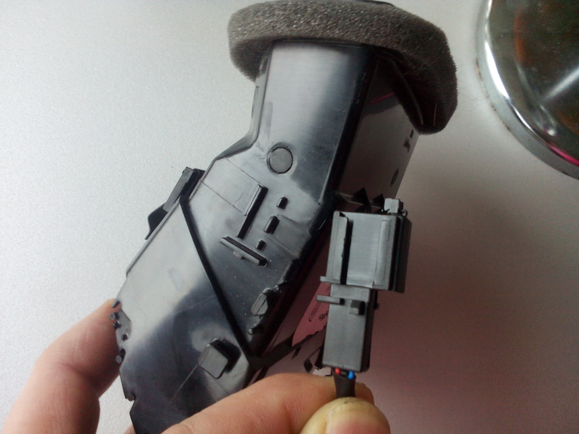 Итак, снимаем воздуховоды. Важно! Хромированные кромки воздуховодов очень нежные, повредить кромки очень легко. Снимать надо аккуратно, используя широкие лопатки или что-то подобное. Воздуховод со стороны водителя снимается совсем легко, моно просто вытолкнуть его изнутри, просто сняв крышку сбоку торпедо, где предохранители. Справа такой номер не пройдет. Центральный снять труднее всего.