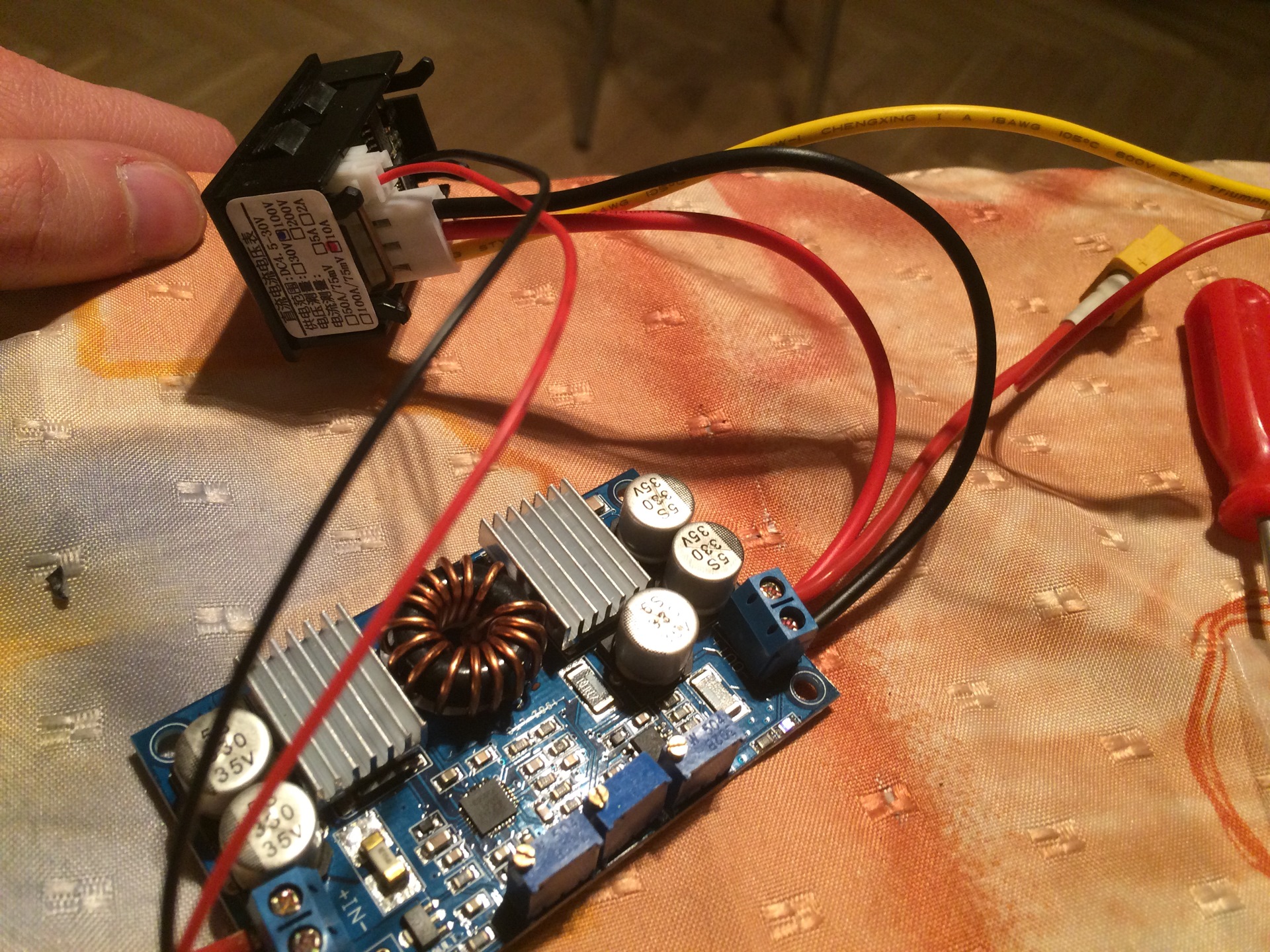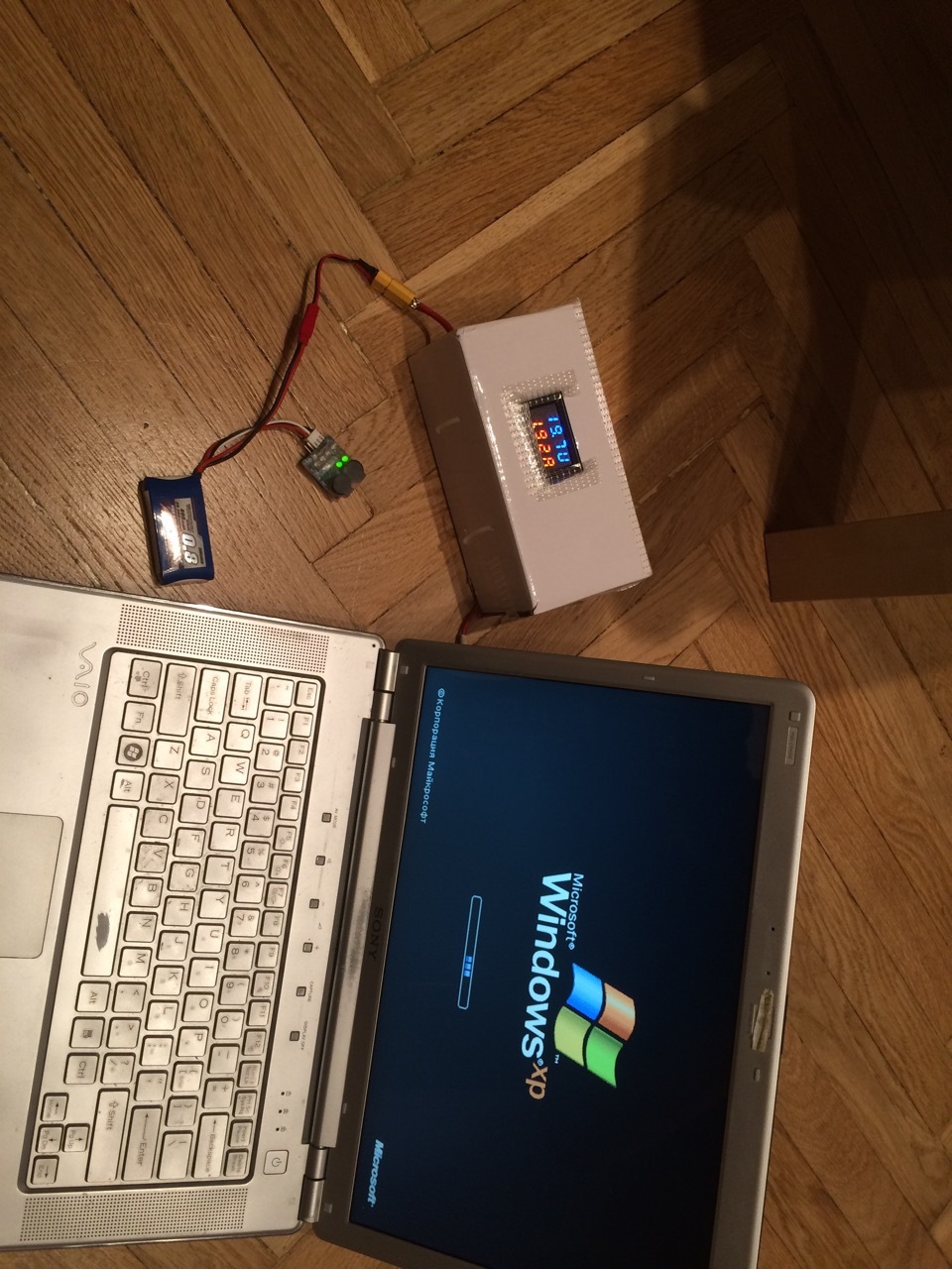 3) достал из старых запасов экранчик на котором показывается напряжение и ток. (можно обойтись и без него просто мультиметром убедиться что на выходе у нас 19-19.5 вольт) Экранчик стоит баксов 5-7.