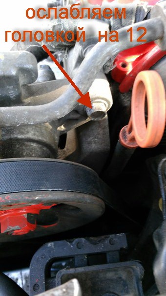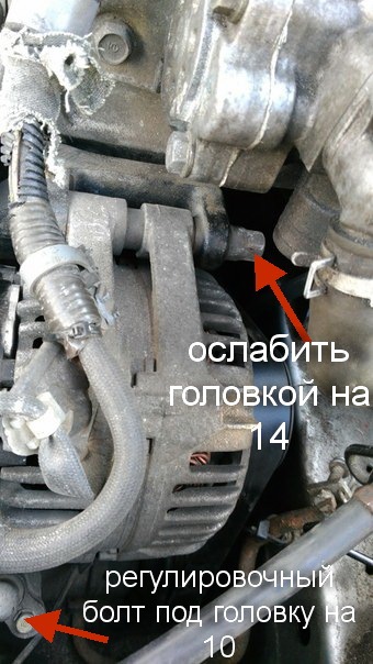 Не откручивайте этот болт на который указана стрелка (регулировка генератора), это болт трубки кондиционера, если его расслабить начнет испаряться фреон, а вот рядом болт на генераторе, это тот который нужен, чем думал автор когда делал картинку ни кто не знает