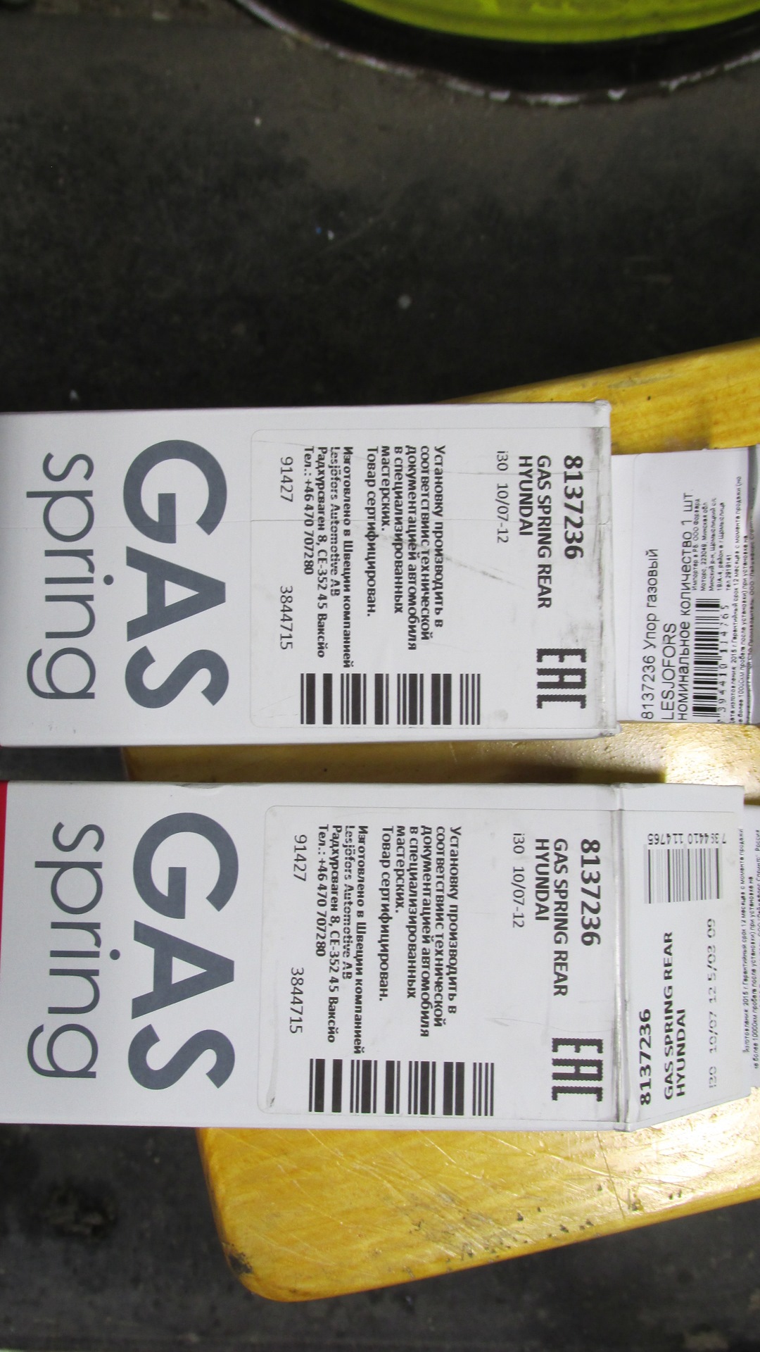 Амортизатор багажника у меня работал не так, как надо уже достаточно давно! Сильно способствовал этому тот факт, что я обшил дверь багажника ШВИ. Из предложений по замене у нас в городе мой выбор пал на lesjofors 81 372 36 Шведского производства. Ценовой сегмент у них средний! С оригиналом (номера по каталогу: 81771-2R000 и 81781-2R000) решил не связываться из-за его цены в 30$ за одну штуку:((