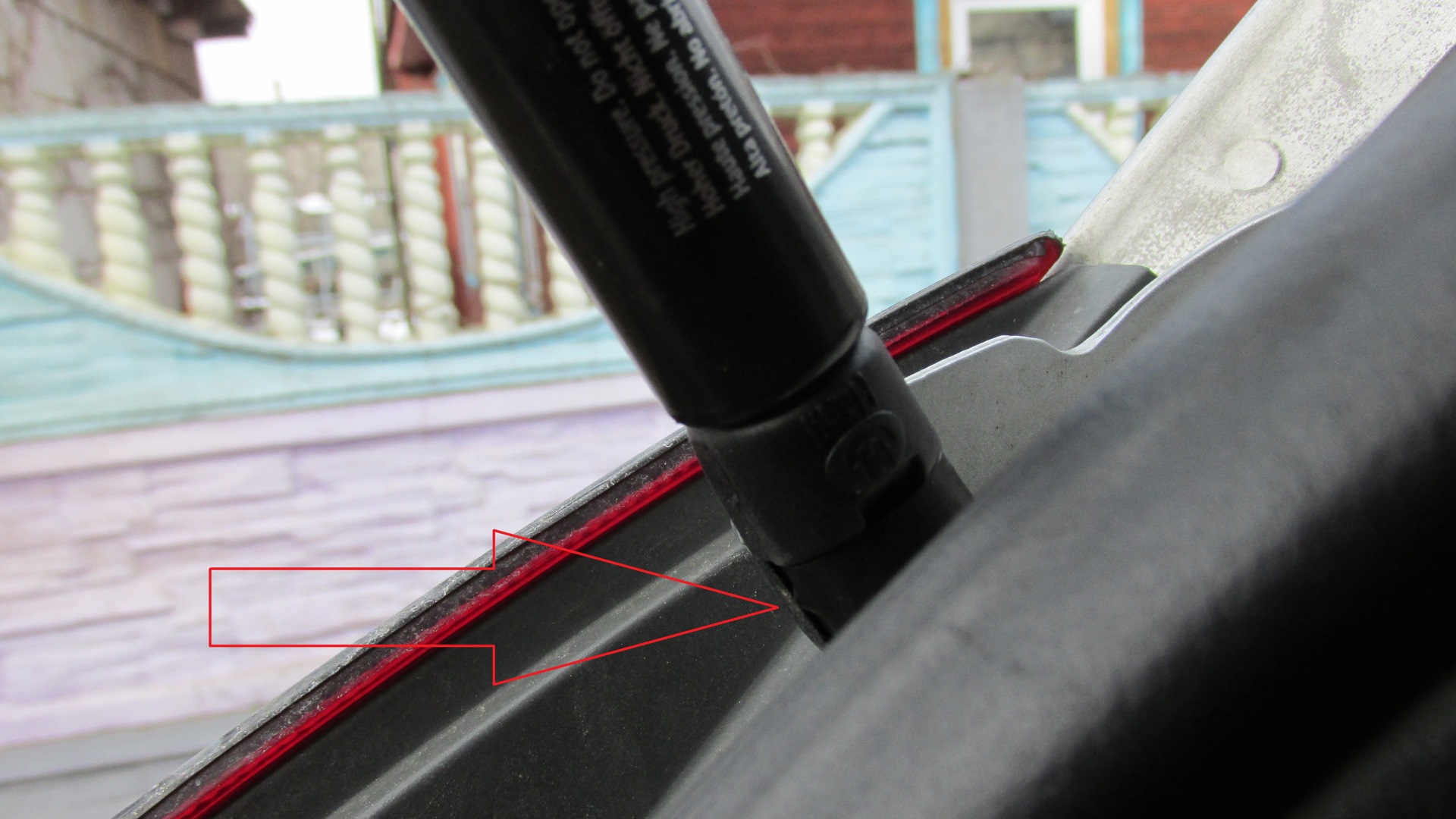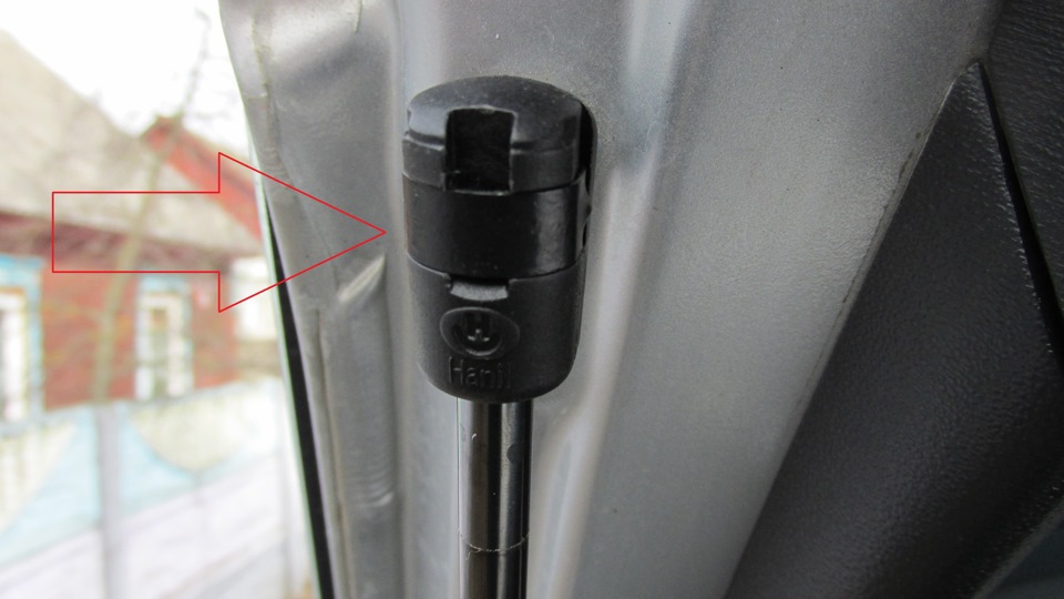 Теперь непосредственно о снятии! Откройте дверь багажника и зафиксируйте в открытом положении (советую попросить друга помочь, чтобы не держать дверь на себе). Подденьте плоской отверткой и снимите фиксатор верхнего шарнира амортизатора.