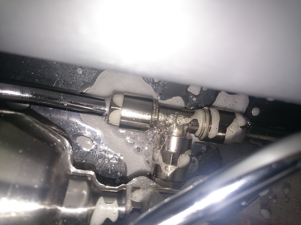 Я побежал искать зарядник. Пока бегал, давление уже уменьшилось немного. Оставил на ночь — всё сдулось в ноль:( Ещё никогда Штирлиц не был так близок к провалу:) Но ничего, накачал снова, принёс воды с шампунем, чтобы мой хардлайн был мягким и шелковистым. Попшикал на фитинги и нашёл кучу утечек. Большинство находятся в контуре продувки — на него в общем-то пофиг, т.к. его задача держать давление, пока идёт накачка, а потом оно всё равно стравливается через осушитель в атмосферу, и утечка на 0.5 атмосферы в час здесь погоды не сделает. Принудительно стравил контур продувки и стал следить за основными ресиверами.