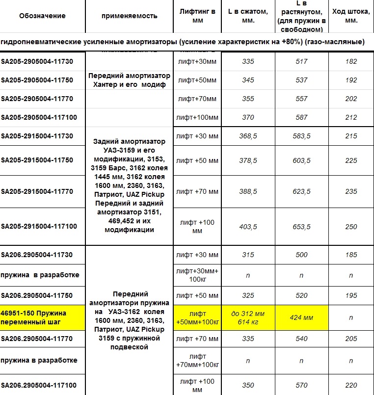 Ниже я приведу таблицы типоразмеров амортизаторов линейки "Трофи-Лифт" и их маркировки.
