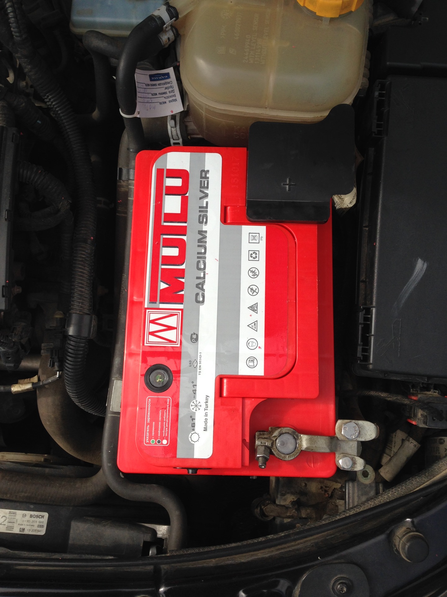 Теперь об аккуме, замерив плотность самостоятельно, увидел не утешительные показатели, а именно 1,17 примерно в каждой банке, почти суточный заряд ничего не изменил, и тут вычитав пару статей в интернете, решил я попробовать заменить электролит полностью, т к цена его за 5 литров всего 100р думаю терять нечего, да и лишний опыт не помешает, все равно новый покупать в любом случае, в итоге слив старый, промыл его дист. водой, далее залил новый электролит с плотностью 1,28 и поставил на зарядку. Простояв гдето 7часов заряд принимать он перестал, индикаторзагорелся зеленым а заряд показывал 13 с чем то, ну думаю возможно получилось, и поживет он ещё, но радость была не долгой, т к спустя пару дней он стал стремительно разряжаться сам по себе и плотность упала снова. Короче решил я не мучаться и поехал за новым. Взял точ такой же как и был, Мутлу на 66а/ч и к тому же получил скидку на 700р при обмене своего старого, так же дали год гарантии и бесплатное обслуживание на весь срок эксплуатации, ну теперь думаю думать о нем в ближайшее время не буду, т к по выпуску ему всего 3 месяца!