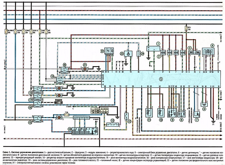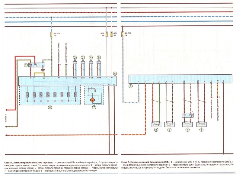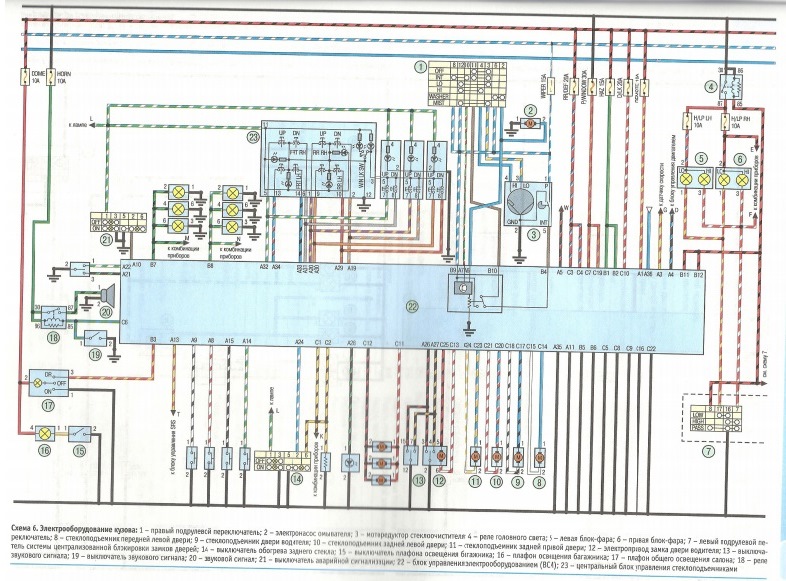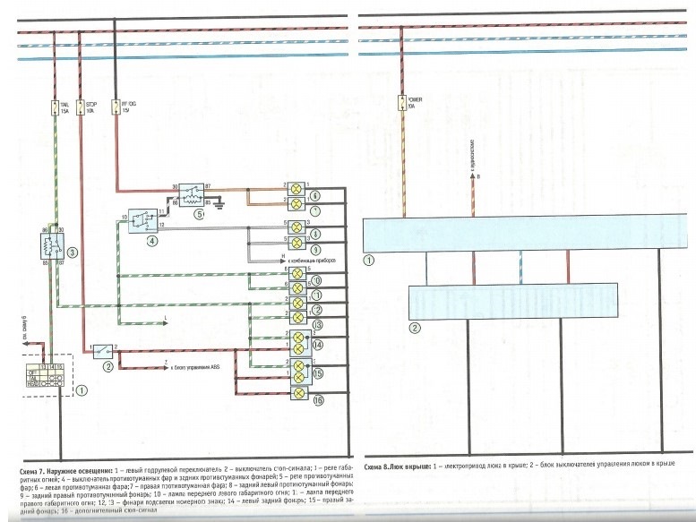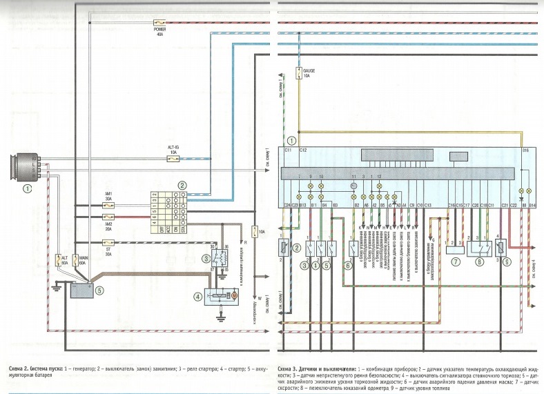 У меня вопрос (возможно я тупой, но…). Какой ума лишенный составлял схемы эти из книги? На них же половина не понятно, потому что криворукие чёрный провод (минус) частенько меняют на красный с полосками разными… Как пример — посмотрите на схему ближнего и дальнего света. К лампочкам подходят с двух сторон красные провода, эта как бл*ть? Та же схема, тот же участок — реле дальнего и ближнего света, берут минус, кидают его на электромагнит (тут всё норм), так и надо, но этот же минус кидают на 30 контакт, где должен быть +, т.к. + в разрыве должен быть, а при срабатывании эл.магнита реле — не в разрыве и идти на лампочки через предохранители, а не минус через преды бл… Зла не хватает