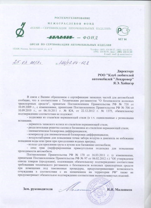 Только что переслал документы на машину в представительство LR в России. Жду документы по сертификации.На наш год выпуска.