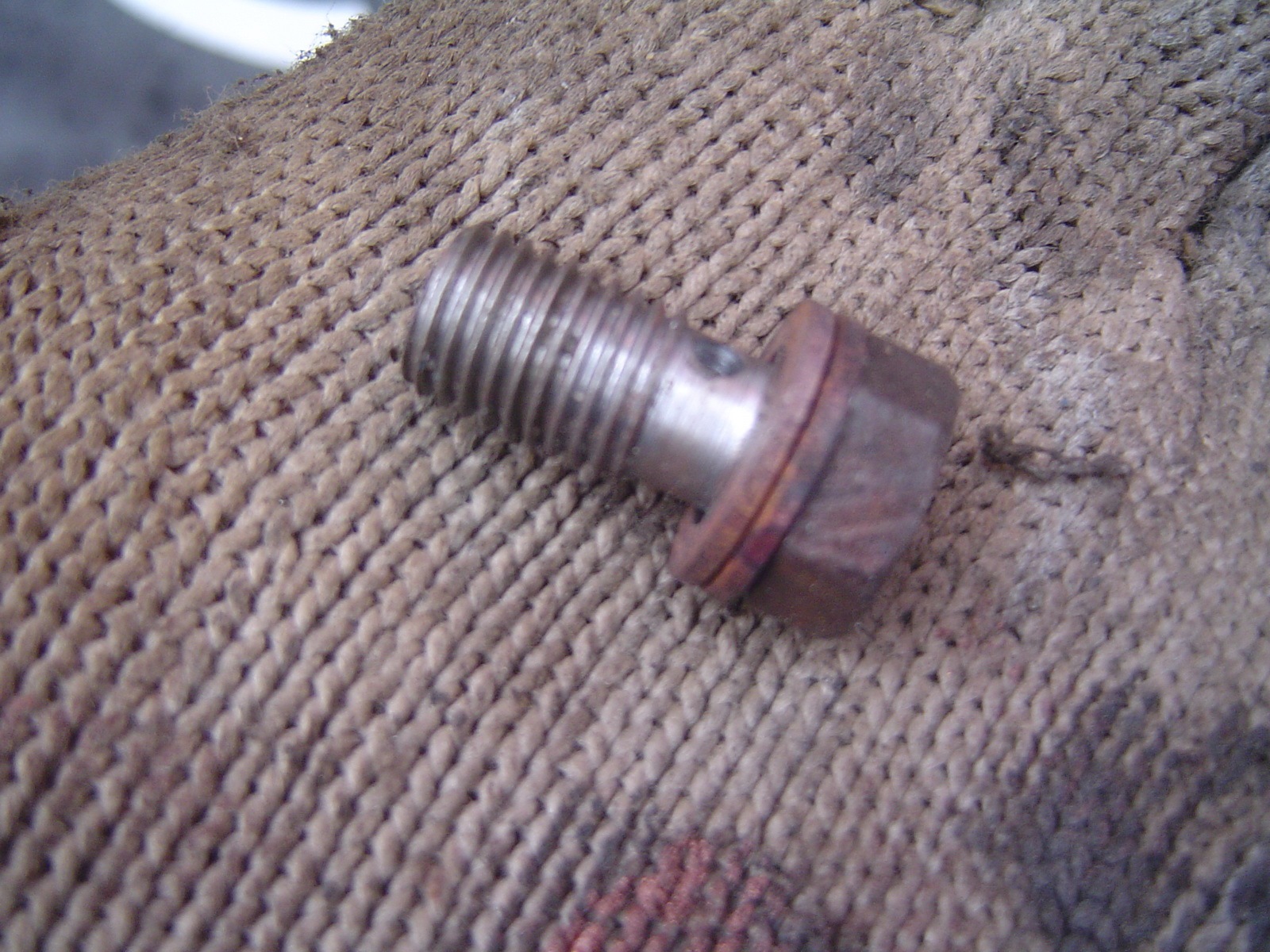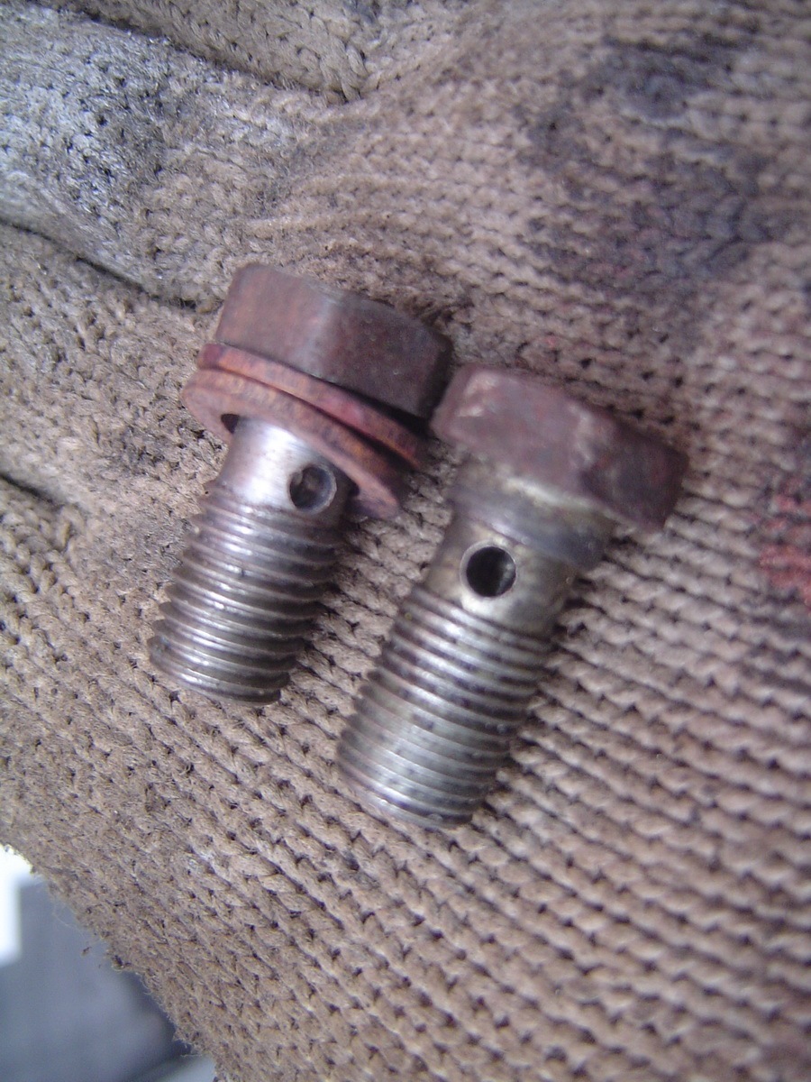 Для подключения заднего шланг с креплением типа "банджо" пришлось изготовить новый крепежный болт по образцу болта переднего суппорта (слева самодельный) — с резьбой как в заднем тройничке