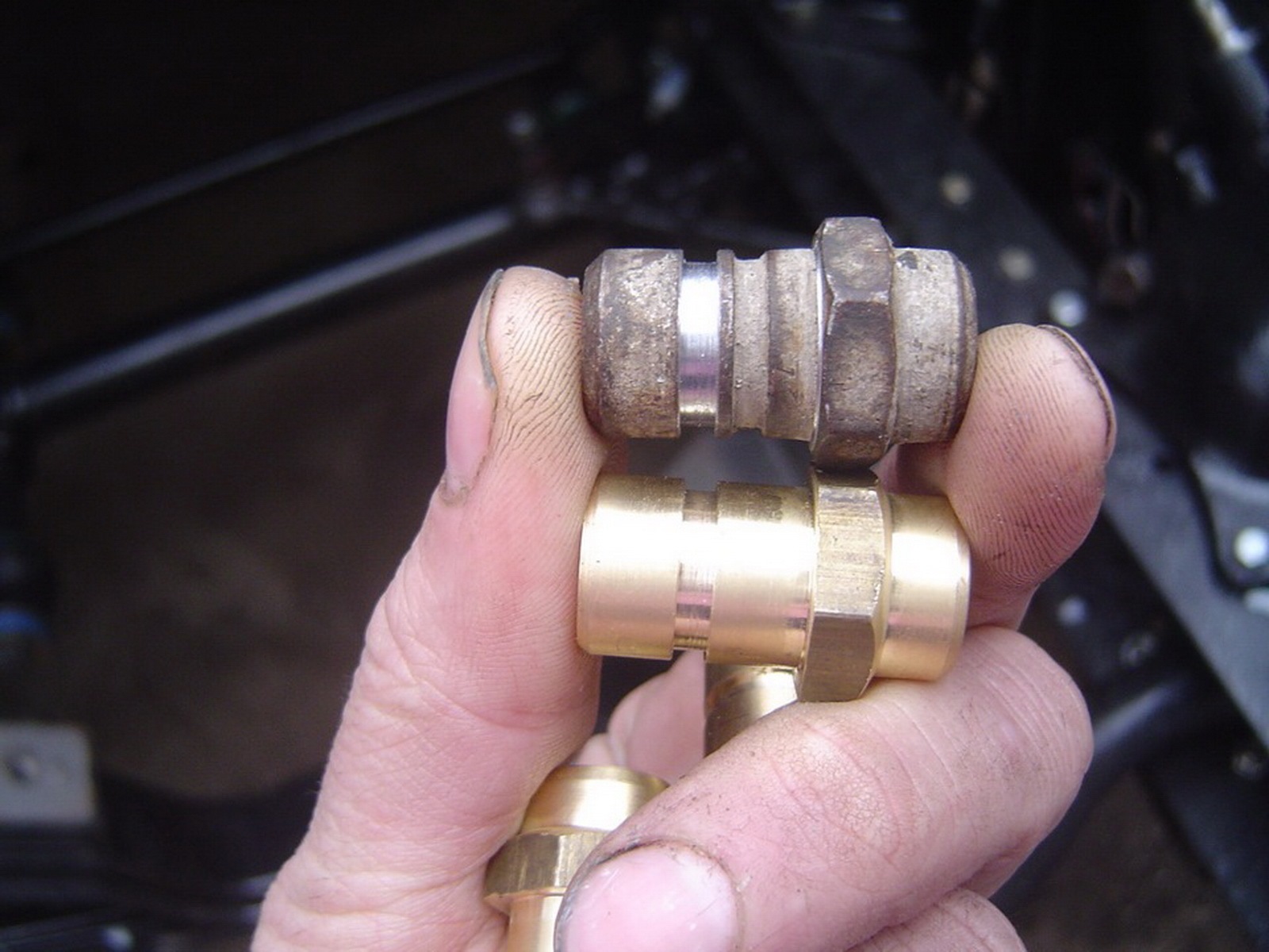 а в месте перехода шлангов через раму (с учётом толщины усилителя рамы) — были проточены штатные переходники и изготовлено 4 новых из латуни