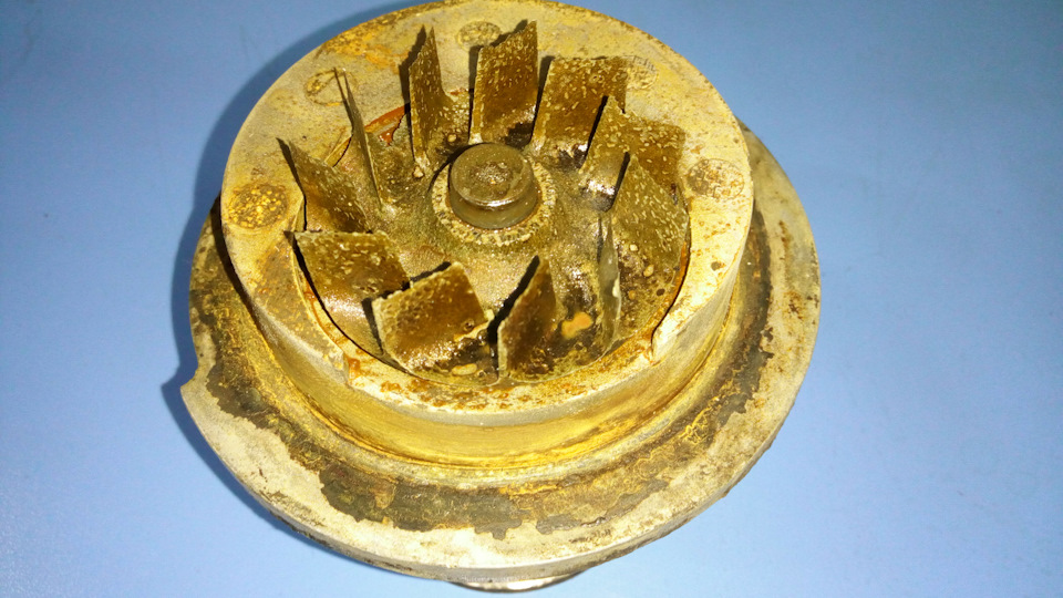 Чувак помпу с антифризом вообще не менял. Чтобы промыть систему охлаждения потратили 100л воды и химии. Видишь помпу как кавитационная коррозия съела? Лопасти стали тонкими и острыми как бритва. 200тыс проездил. Помпа стоит 2300, а работа по промывке и замене с материалами обошлась в 15шку. Экономить будете?