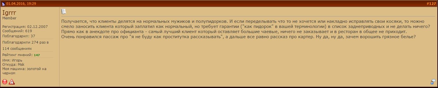не поленился, прочел все! не прав товарищ, получил столько бабла (115тр) и зажал ремонт крыла? да и стилистика общения с клиентами не позволит ему долго работать (((