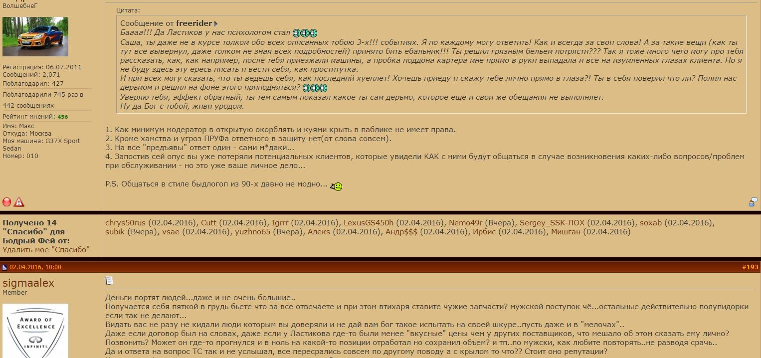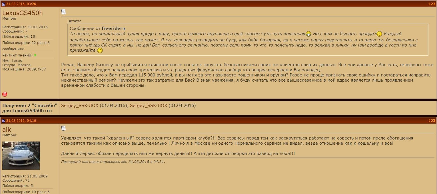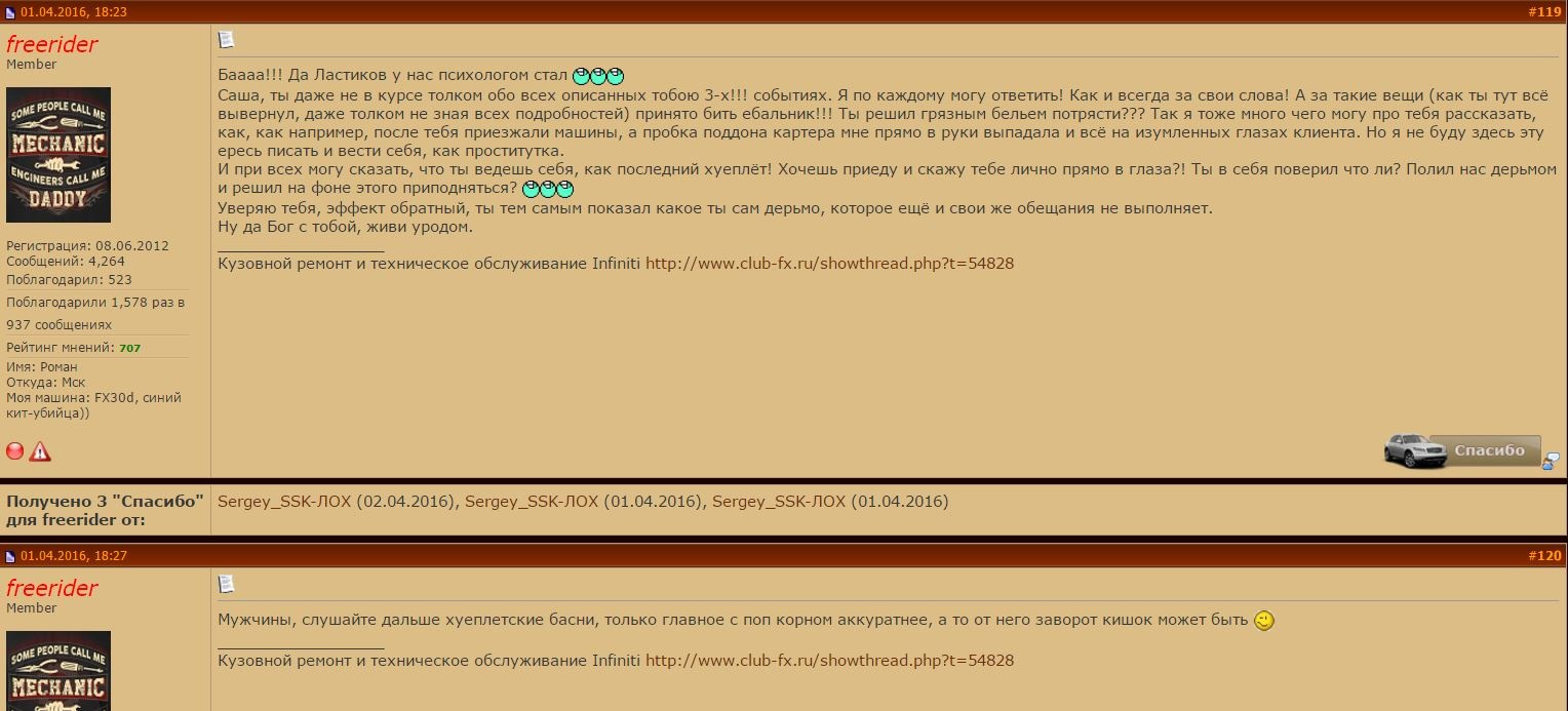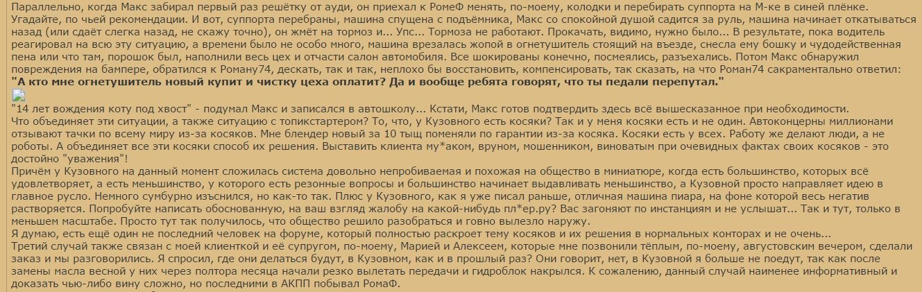 Так вот в ходе обсуждения по моему отзыв Роман, сотрудник Кузовного-мастера, отвечающий за ТО, называет меня мошенником и вруном, угрожает слить мои данные неким "безопасникам", наверное в надежде на дальнейшую расправу со мной=)))