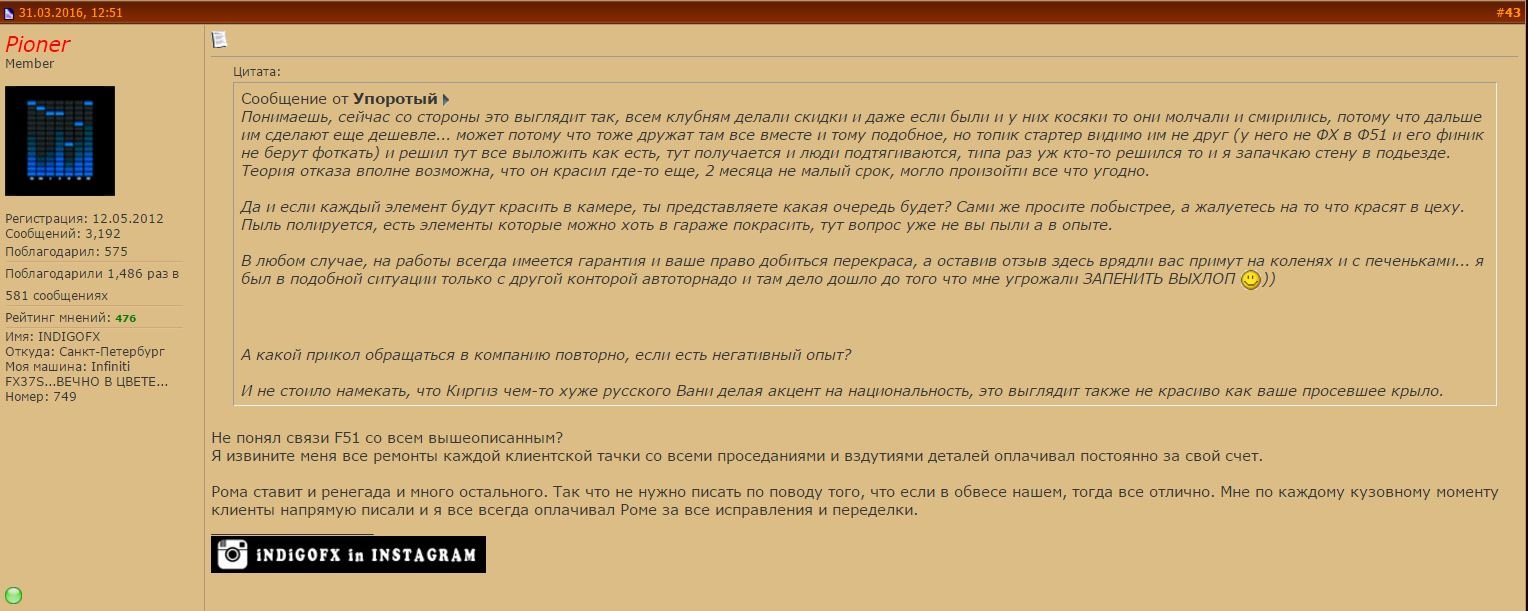 Но самое интересное началось тогда, когда я запостил свой отзыв на сайте club-fx. Дело в том, что кузовной-мастер.рф является клубным сервисом по покраске Инфинити, постят свои отчеты, сидят сами на форуме и форумчане к ним едут по кузовщине, кузовной-мастер.рф по итогу выкладывает красивые промо фото в свой интаграмм с крутыми финиками, и на меня сработал эффект: типа если им доверяют красить финики и srt8, то на них можно положиться в случае чего.