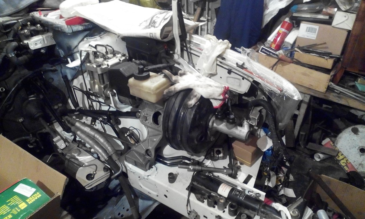 Передние тормоза перебраны и установлены. Новые тормозные шланги, ремкомплект манжетов, пыльники направляющих пальцев ATE, суппорт под 28 мм вентилируемый диск. ГТЦ+ВУТ от двигателя М60 на оригинальном креплении, все отмыто покрашено и установлено на недавно приваренные кронштейны.