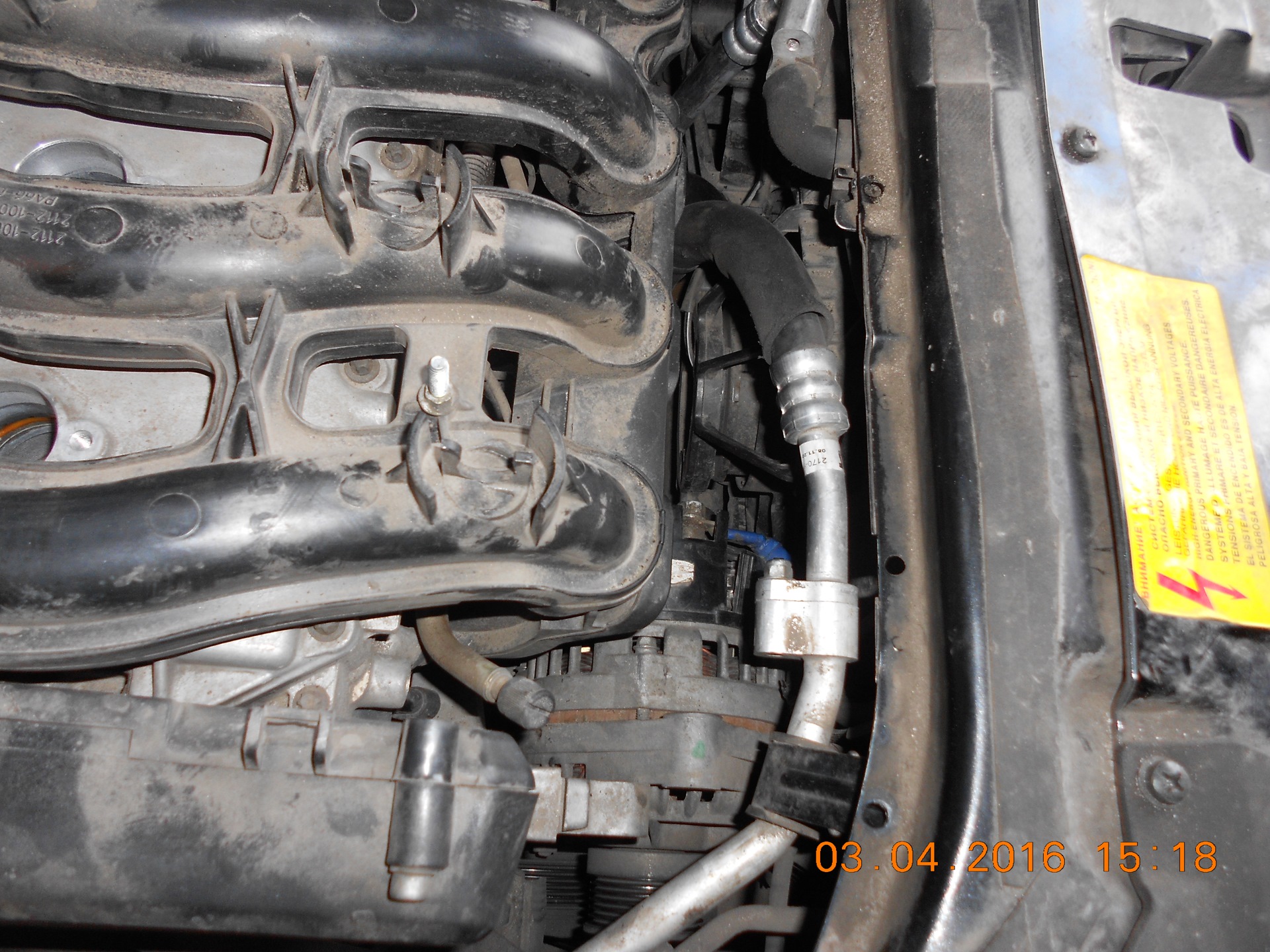 Все провода, шланги вентиляции, дроссель убираем. Рессивер закреплен на 2 болта и 3 гайки. Гайки с левым болтом откручиваются легко, подлезть можно. А вот с правым болтом проблема, генератор не дает.