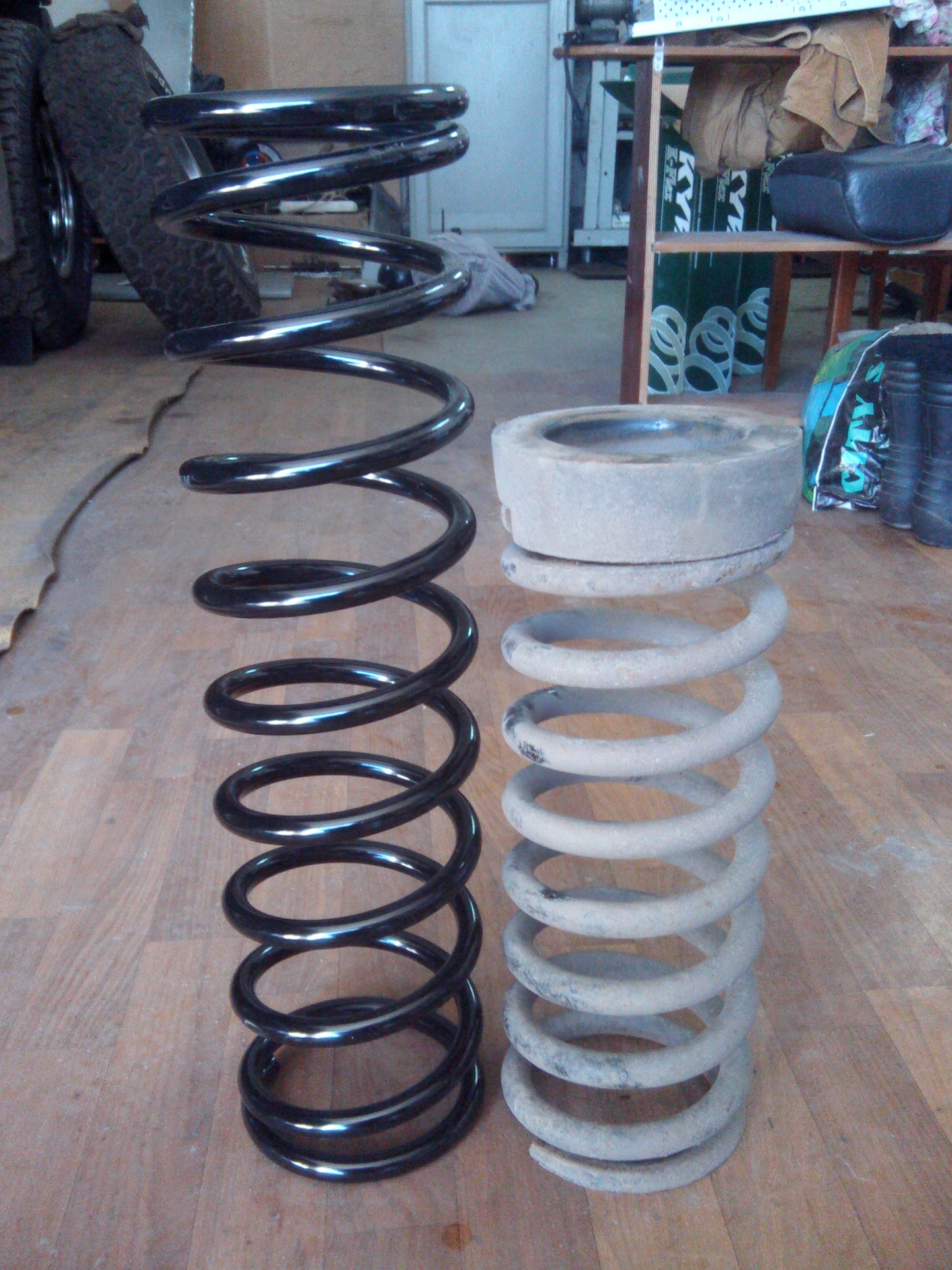С моей точки зрения, для "гражданского" использования автомобиля вполне достаточно высоты пружины 340-350мм. — при такой высоте заднее колесо становится "вровень" с рамой, а в передней подвеске остаётся достаточно хода отбоя. Поэтому снял пружины, отрезал снизу пол-витка — получились более-менее приемлемые 360мм. Всё равно несколько высоковато…