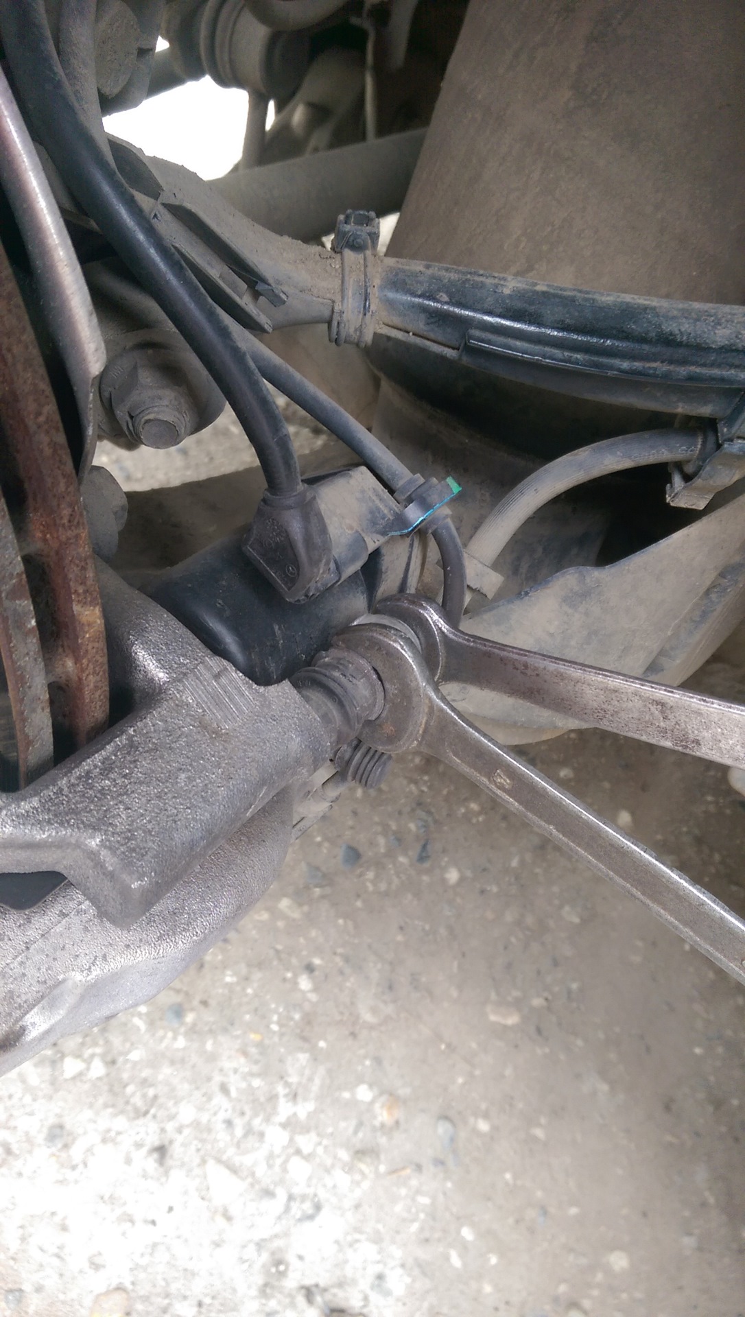 После того, как накладка снята, выкручиваем болты на направляющих суппорта при помощи двух ключей (один на 13, второй на 17):