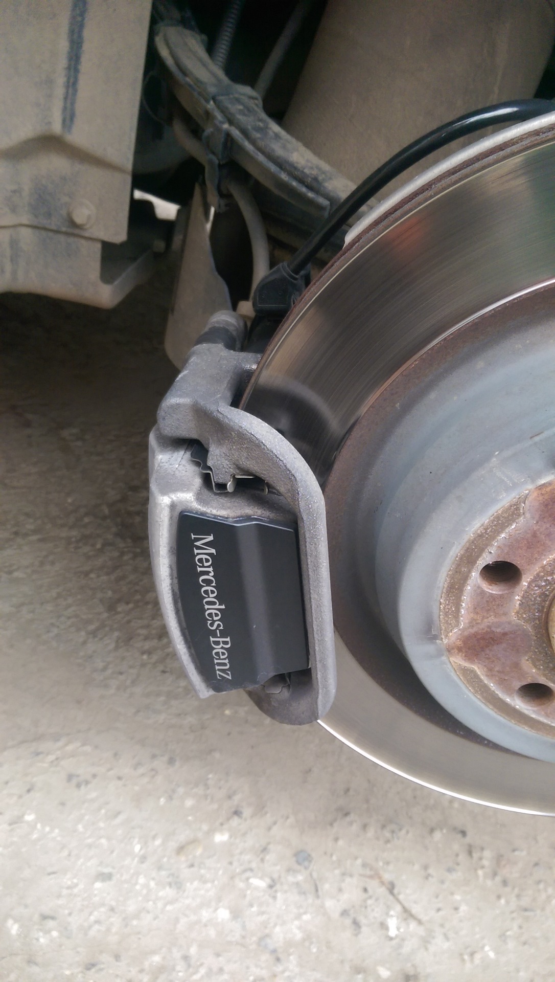 После этого снимаем колесо. На суппорте снимаем декоративную накладку с надписью Мерседес-бенс. Снимается она достаточно легко — поддеваем плоской отверткой и сдергиваем ее (никаких зажимов — сидит просто жестко ножками в пазах).