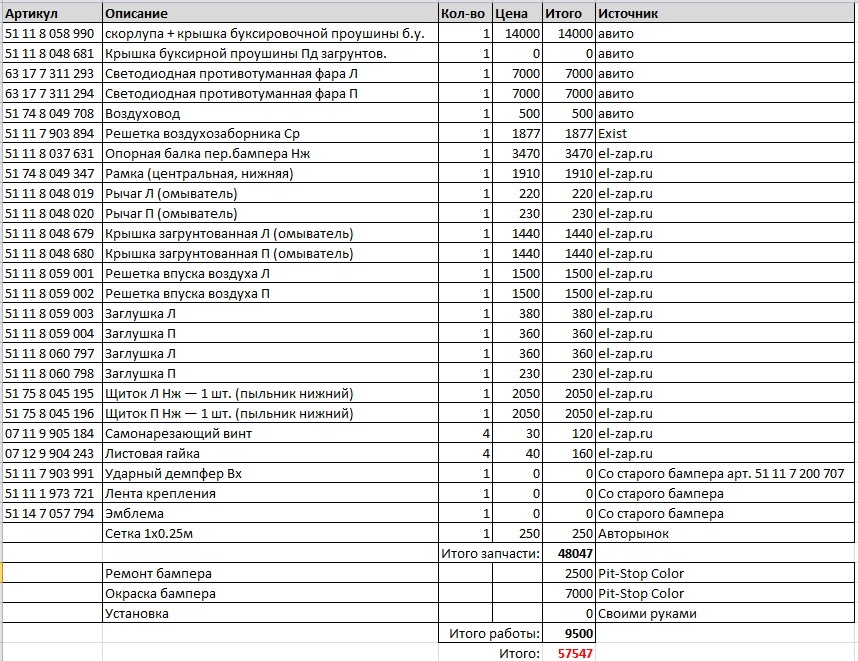Начал обзванить разборки, цены на Авито колеблились от 12 до 20 тыс за голую скорлупу и от 45 до 50 за бампер в сборе.