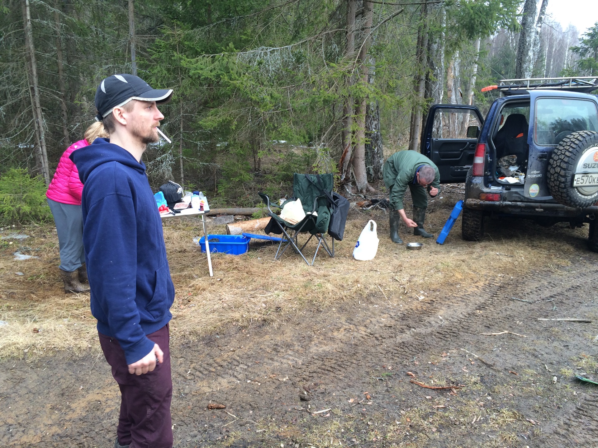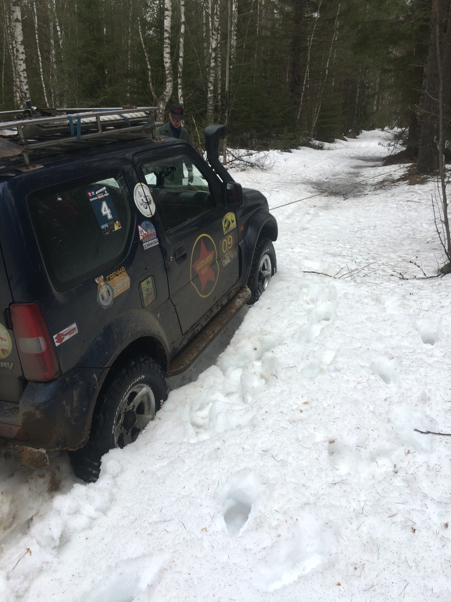 Итак, вернемся: первый полчаса мы двигались от ЛЭП до лесочка, далее лайтово в лесочке, а вот потом маршрут стал усложняться — экипажи периодически начали прилипать. И таким макаром, спасая, тягая, лебедясь, толкая и раскачивая, друг друга мы провели на маршруте до места стоянки еще пару часов. Итого, по ощущениям, весь маршрут от точки заезда до поляны занял у нас часа три. Застревали на всех мы раз 10. У Жени Mykaka в процессе попрыгушек по подснежным ямам в добавок еще и разбортировалось колесо :) Но он был очень рад и весел. Хотя с забортировкой пришлось попотеть, ведь силовиков у него пока еще нет. Но это мы успешно преодолели. Еще очень порадовал RockFire, который засадил своего сурфа в такой маааленькой ямке с водичкой по середину его гигантских колес. А дальше мы его трехтонного, или сколько он там весит, монстра тягали мелкими джимниками туда-сюда примерно минут 40. Уже дико хотелось чего-нибудь зажевать и погреться. Потому что все ожидали синоптьечего плюс 20, а получили, ну где-то плюс 13 уже часам к четырем дня. Спасибо снегу за это! Еще очень волнительно было за машину, т.к я был еще оффроад девственником, то любой стук по днищу и выступающим частям машины мной воспринимался как личная трагедия. Я всегда трепетно относился и отношусь к своим автомобилям и перспектива что-то отломать по жесткому очень пугала. А еще как дикий нуб вообще не взял с собой ничего из зип, даже ни одной тех жидкости :(. Но надо было ехать дальше и мы ехали, защиты, которыми я днище обложил вроде справились на отлично! Редуктор моста только ничем не защищен. Немного напрягает, или он достаточно прочен? И вот, наконец, мы на полянке! Теперь можно перевести дух и покушать. Эмоции зашкаливают. Я испытал всю палитру чувств, от страха до полного восторга и снова к страху! В лагере же, ближе к вечеру, я и вовсе почувствовал себя эмоционально опустошенным! Если честно, уже хотелось тупо пригубить чего покрепче.