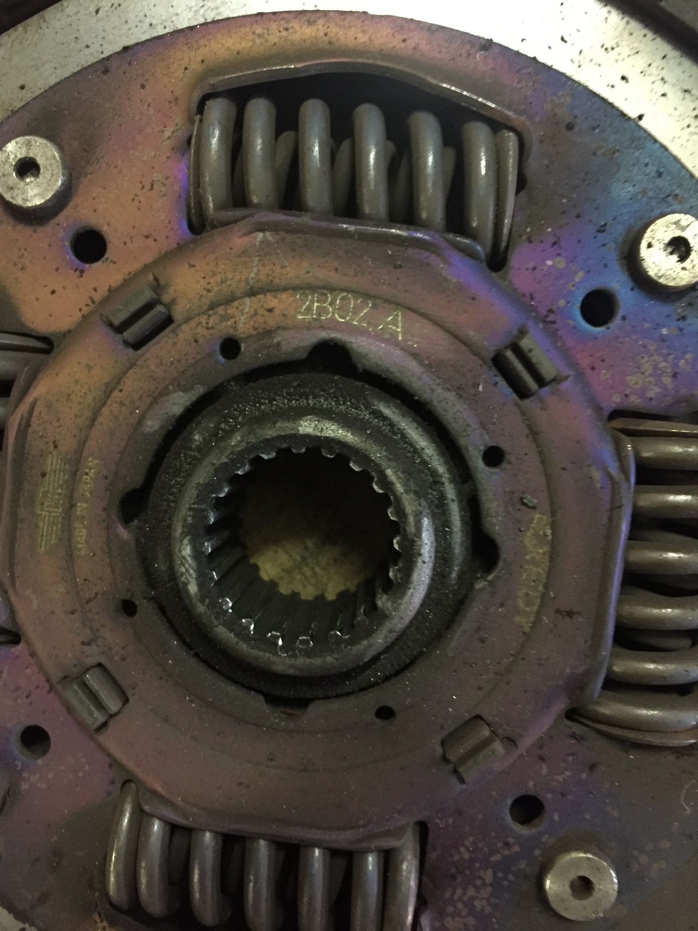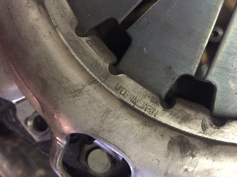 3. Сцепление. Зимой при морозе начались проблемы. При трогании было так, как будто оно схватывало не сразу, а с пробуксовкой. Весной в придачу "при газ в пол" на 3500-4000 оборотах возникало ощущение, что машину дергали назад, такой легкий затуп. Был куплен комплект диск-корзина-выжимной. Все Exedy. Замена идет с демонтажем подрамника и рулевой рейки. В общем тот еще геморрой. Мертвым оказался только выжимной. Заменил всё, а заводские корзину и диск оставил на всякий пожарный в заначке. Кому интересно, фотографии того, что стояло с завода.