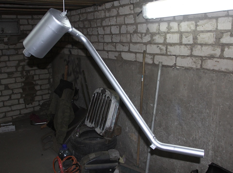 Поскольку двигатель достаточно объёмный, хоть и малооборотистый, а места под глушитель совсем чуть-чуть решили делать по следующей схеме: входящая труба проходит до обратной стенки, затем обратная труба, и труба выхода от первой стенки. При этом первые две сделать с просечками и центральную часть набить каменной ватой.