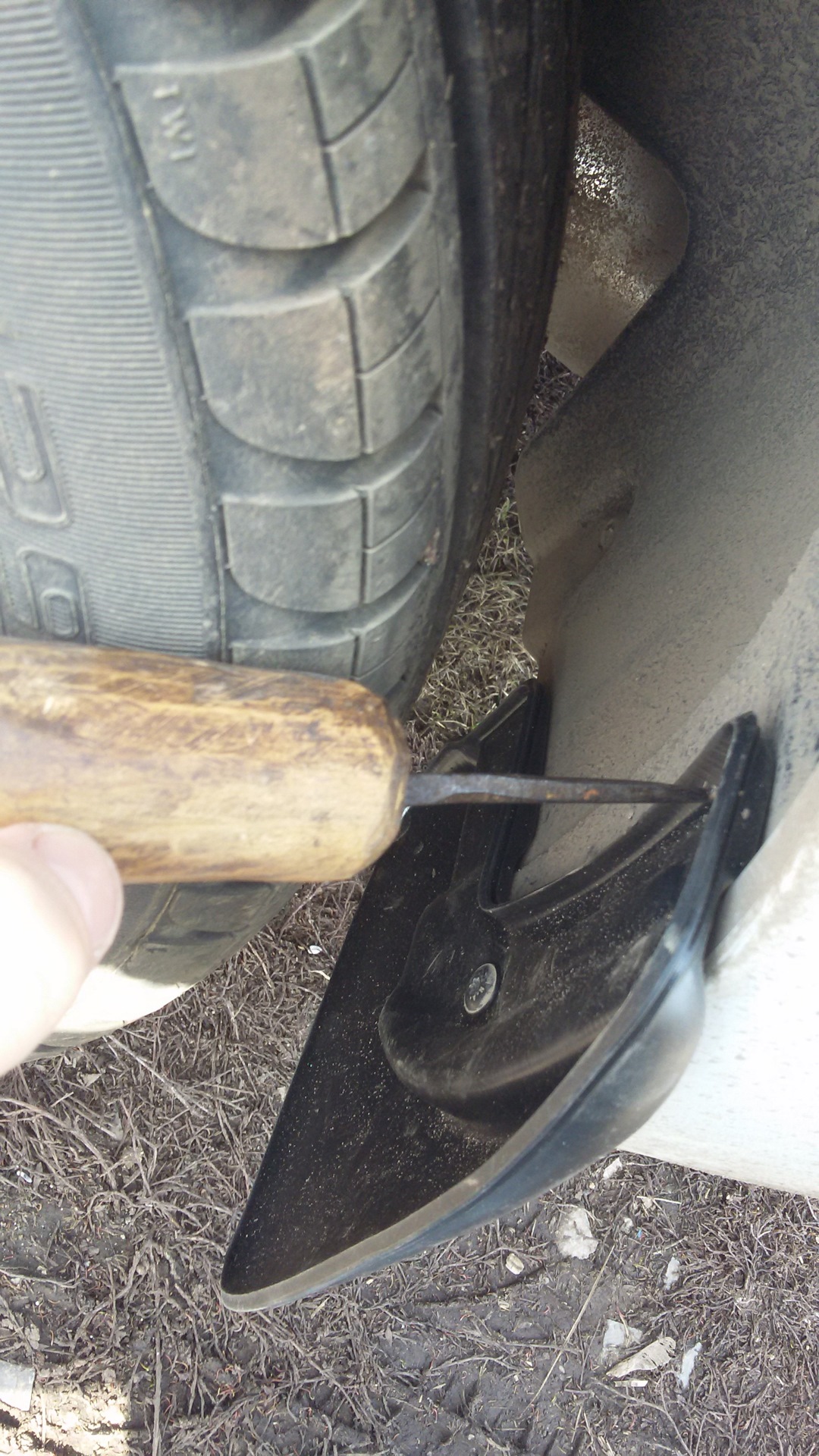 Правый саморез под гайку — шилом проткнуть не смог, колесо снимать надо.