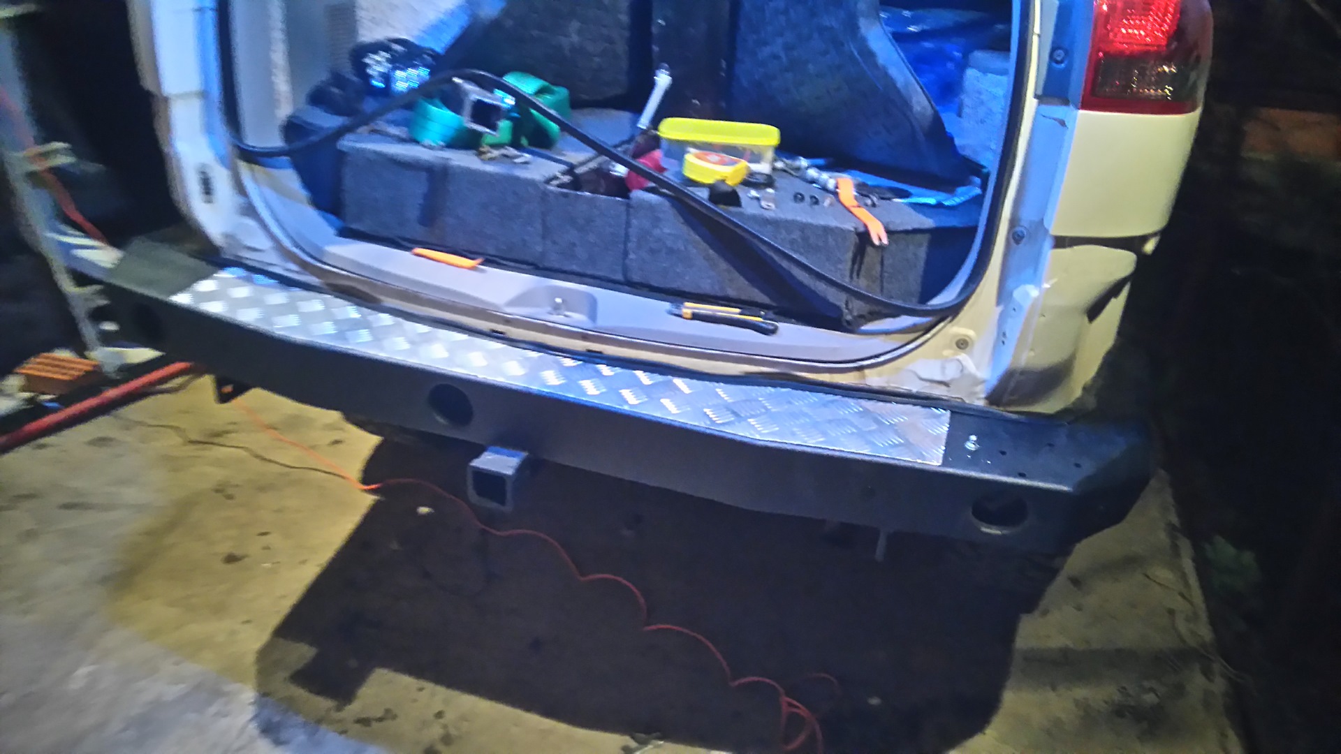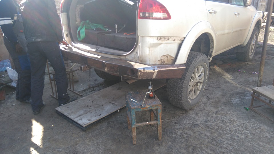 Вот и подошел в финишу процесс изготовления заднего бампера, все это длилось около месяца. Идея возникла спонтанна и мой кум сразу ее подхватил и принялся за дело. Было собрано много информации в интернете на эту тему, много прочитано статей. Все делалось элементарными инструментами которые есть у каждого, не каких станков для металла. Толщина металла 4 мм, вес с калиткой порядка 35-40 кг. Окрашен был рапортом (долго ждал пока наберет прочность). Конечно были не большие проблемы при установке, но все решалось быстро и легко. Стандартный бампер остался лежать в гараже замотанный пленкой, для обрезки купил на разборке БУ за 2500 р. повезло что нашел в цвет (металлик). Результатом работы очень доволен, все было сделано для собственного удобства. Дальше смотрите и судите сами))