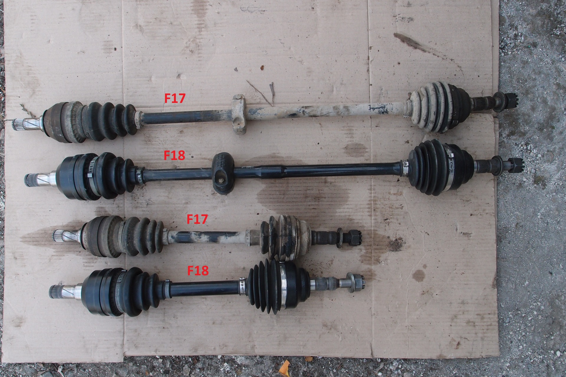3. Приводные валы в сборе. Во-первых внутренние ШРУСы на F18 больше, как в габаритах, так и по шлицевой части. Во-вторых длина валов другая. Валы с F18 короче.