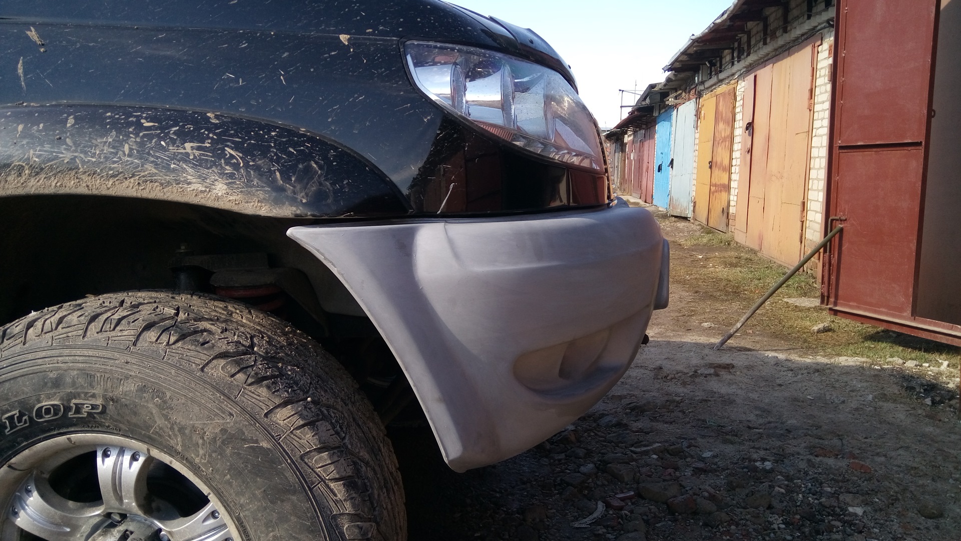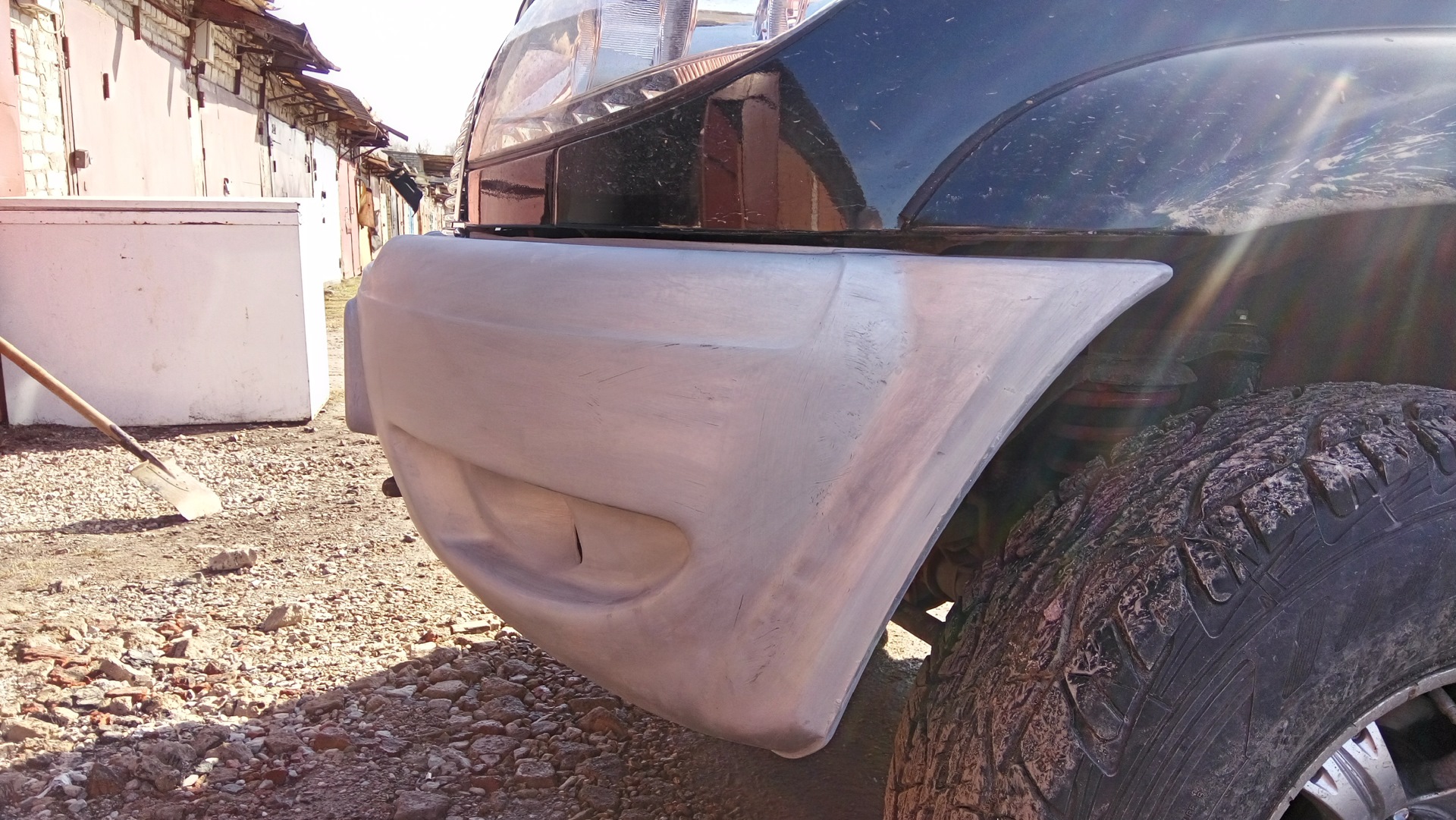 Пришлось подпиливать стеклопластик и подбивать усилитель. Мягко говоря я был удивлён говёности металла из которого сделан усилитель — фольга. Если бы сейчас заказывал бампер, заказал бы с литым усилителем.