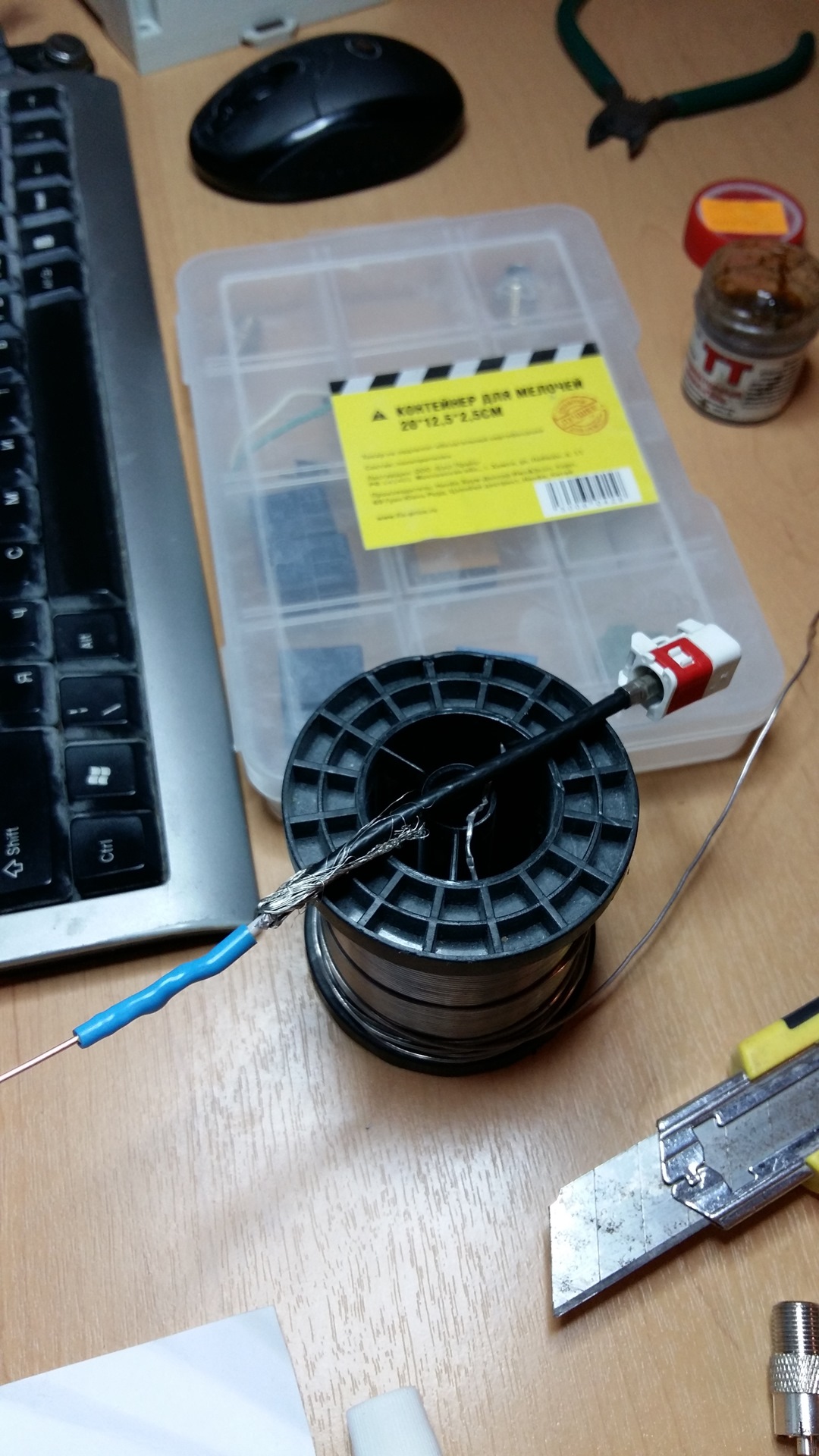 И по подключению. Конденсатор включается в разрыв (последовательно) центральной жилы. Найдите выше фото, где переходник этот лежит на черной катушке с оловом. Там на центральную жилу одета термоусадка синяя. Так вот внутри термоусадки стоит конденсатор. Одной ногой конденсатор подключен белой центральной жиле провода переходника в магнитолу, к второй ноге конденсатора припаян медный провод и он пойдет в центральную жилу разъема антенного, который мы стачивали. Надеюсь понятно объяснил.