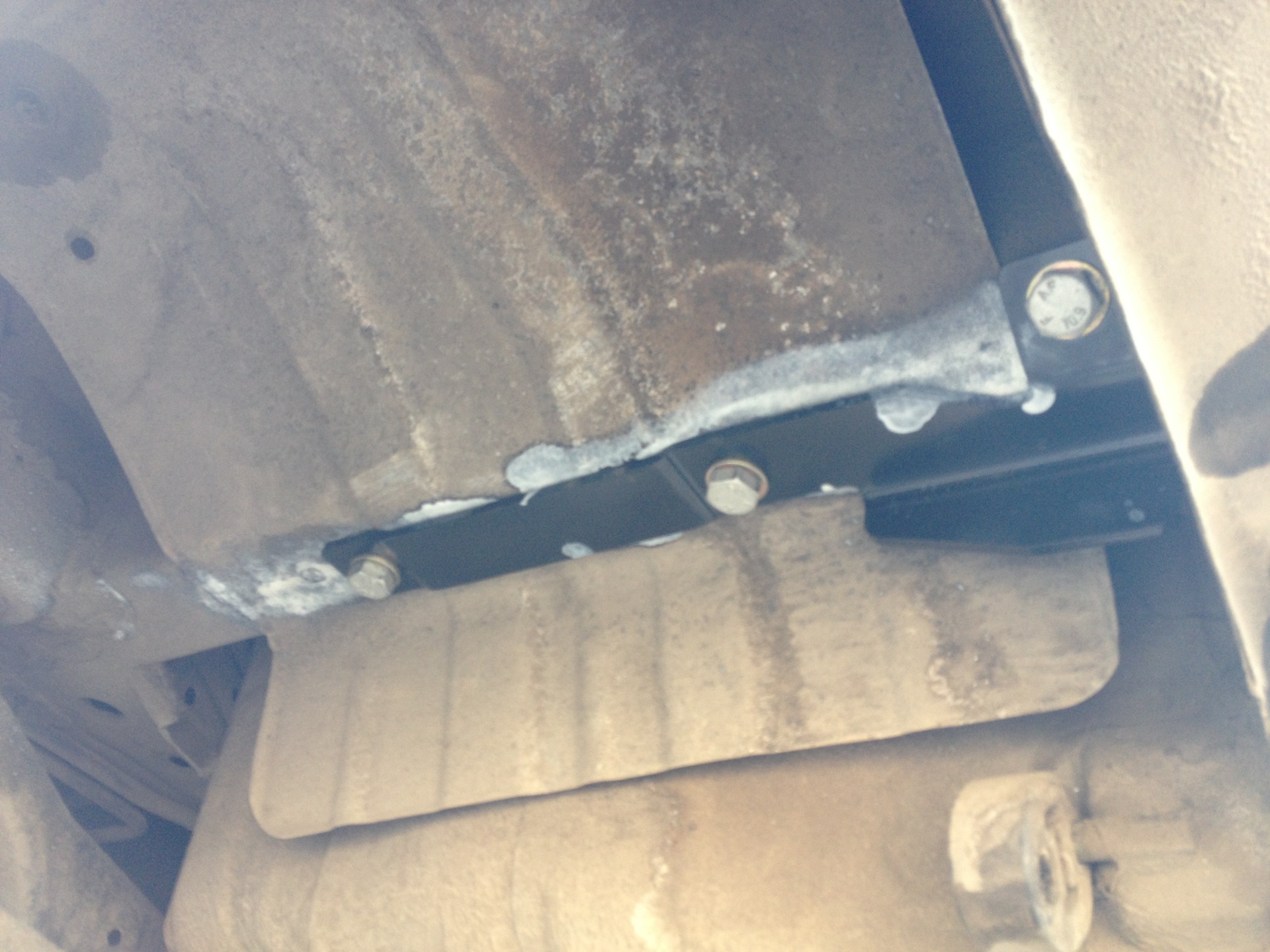 Далее снимаем банки, за банками термокожухи на четырех болтах. Потом откручиваем усилитель бампера, откручиваем кронштейны этого усилителя. Все готово к установке. Первым делом готовим термокожухи — в них надо сделать отверстия мм 12 в тех местах, где кожух прикрывает отверстия для крепления закладных. Далее устанавливаем и наживляем закладные не забывая про термокожхи. После ставим балку фаркопа. Далее затягиваем сначала балу к закладным, потом болты закладных, по три штуки с каждой стороны. Тут я сделал фото крепления закладных со стороны днища.