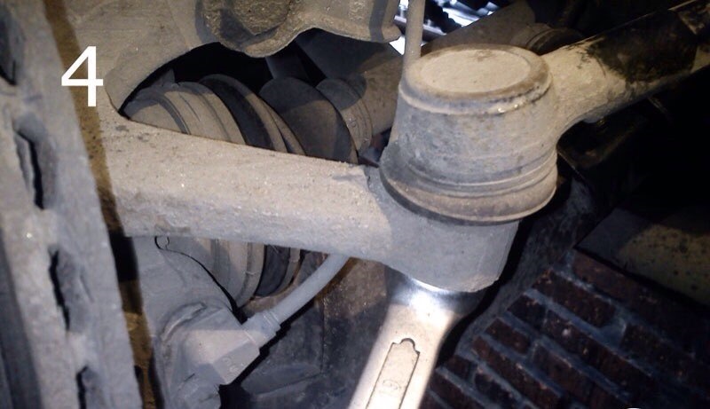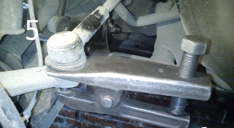 1. Вместе с колесными гайками, используя крепкий ключ на 30, отпускаем гайку передней ступицы (фото 3). Гайку ступицы откручиваем полностью, колесные гайки полностью скручиваем только после того, как поднимете колесо домкратом. После снятия колеса, можно приниматься за рулевой наконечник. Ключом на 19 откручиваем гайку и расспресовываем съёмником (фото 4 и 5).