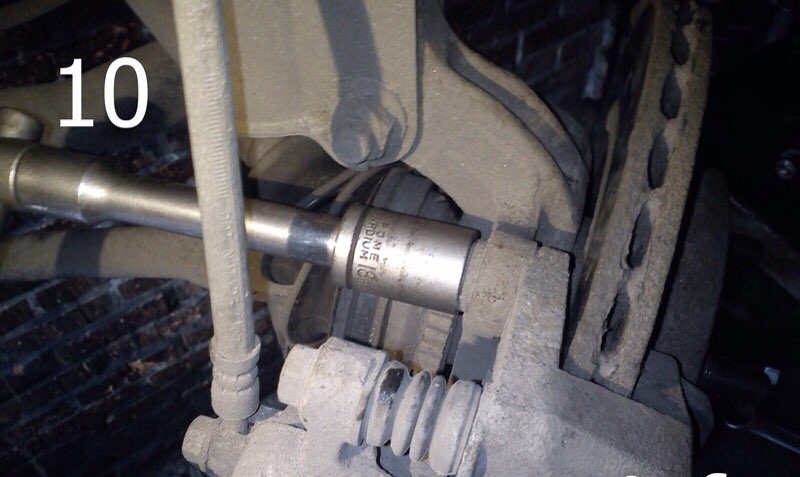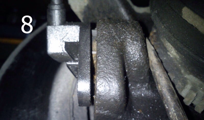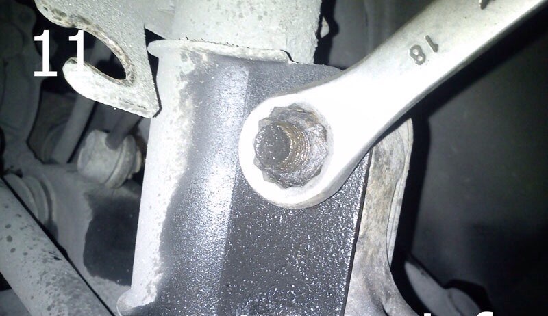 3. Ключом на 18 откручиваем гайку болта шаровой опоры (фото 9), вытаскиваем болт. Разводим отверткой тормозные колодки и опять же, ключом на 18 два крепежных болта переднего суппорта к поворотному кулаку (фото 10). Снимаем суппорт.